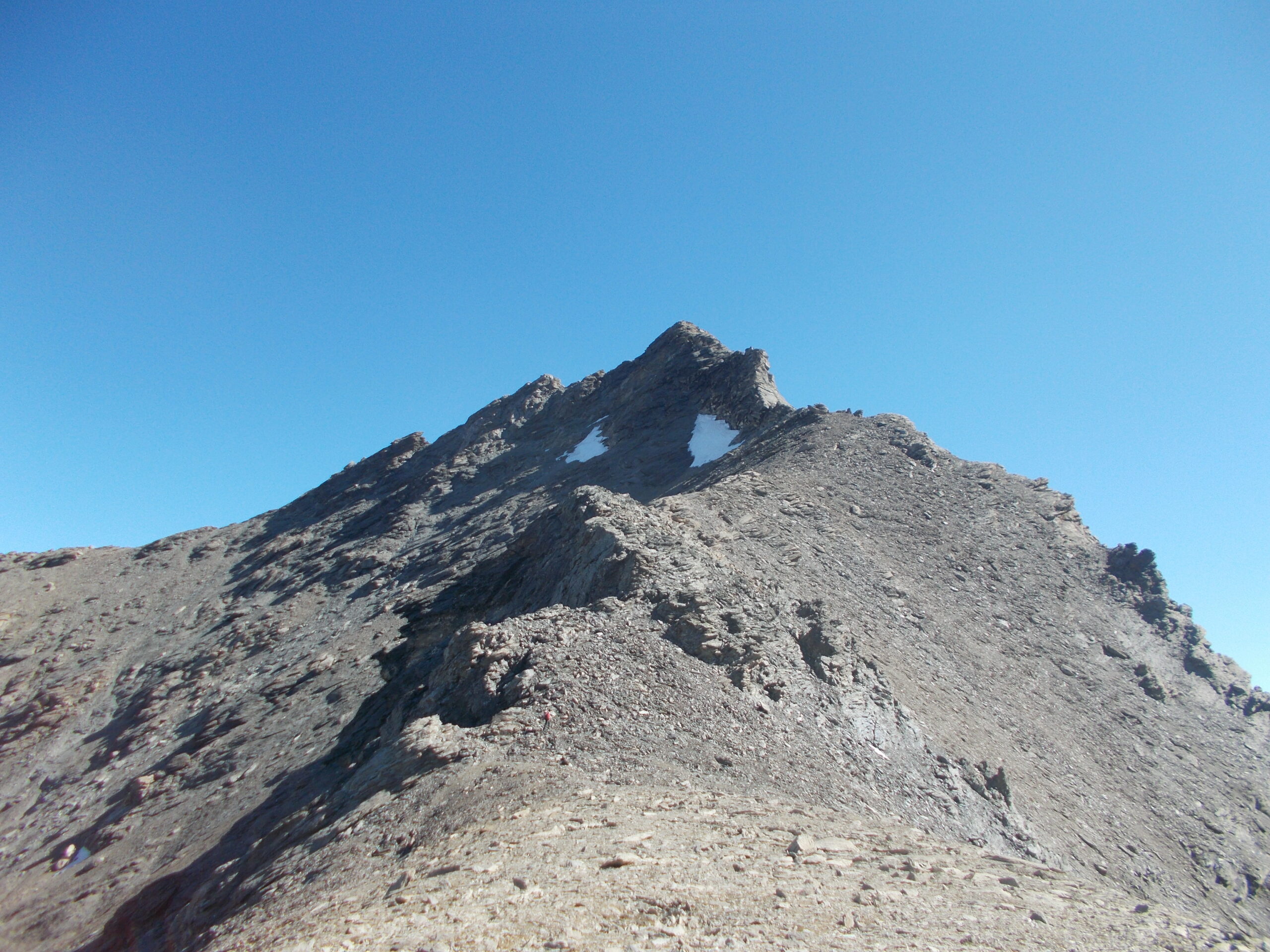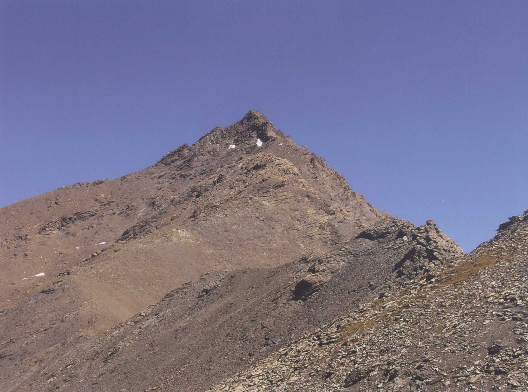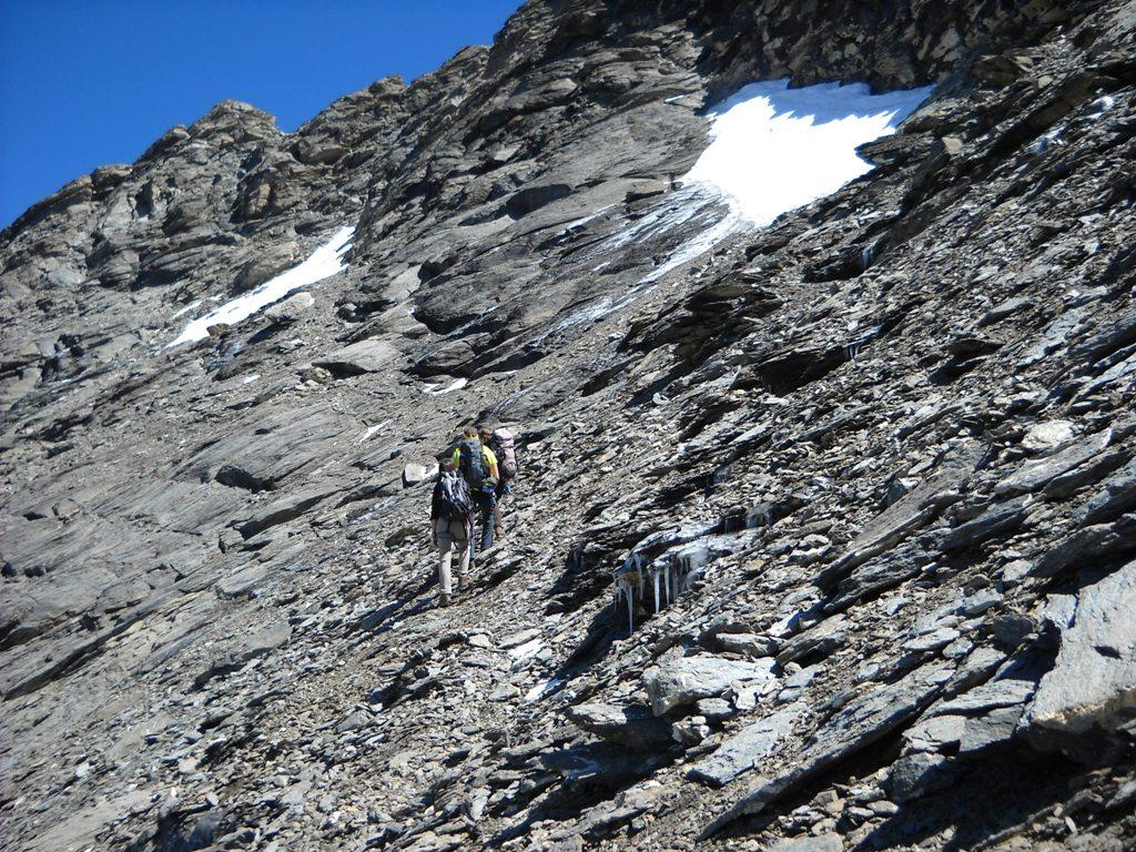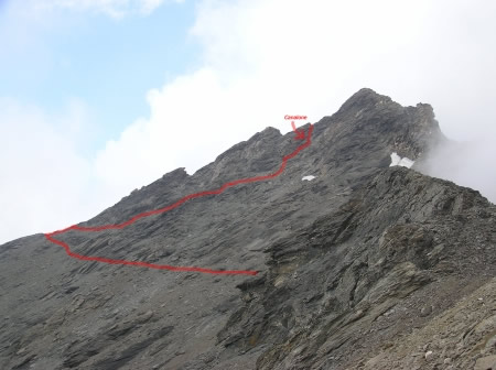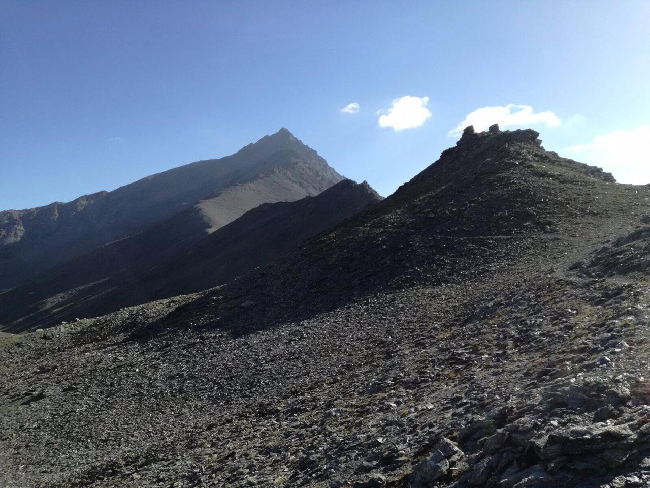 Raggiunto il colle, proseguire a destra percorrendo la lunga cresta SE: il sentiero è ben marcato e segnalato da ometti di pietra. Alla quota di circa 3250 – 3300 m si deve lasciare la cresta SO per raggiungere la cresta NO, attraversando l’immensa pietraia che scende lungo il versante ovest. Purtroppo la traccia per l’attraversamento è quasi invisibile a causa della forte instabilità della pietraia, che cancella rapidamente i segni di passaggio umano. Non fatevi tentare da una traccia segnalata da ometti a quota decisamente inferiore (a causa della nebbia l’abbiamo imboccata per errore): quella giusta comincia in un punto a non più di una quarantina di metri di dislivello dall’evidente parete giallastra che sbarra l’accesso alla vetta lungo la cresta SO.