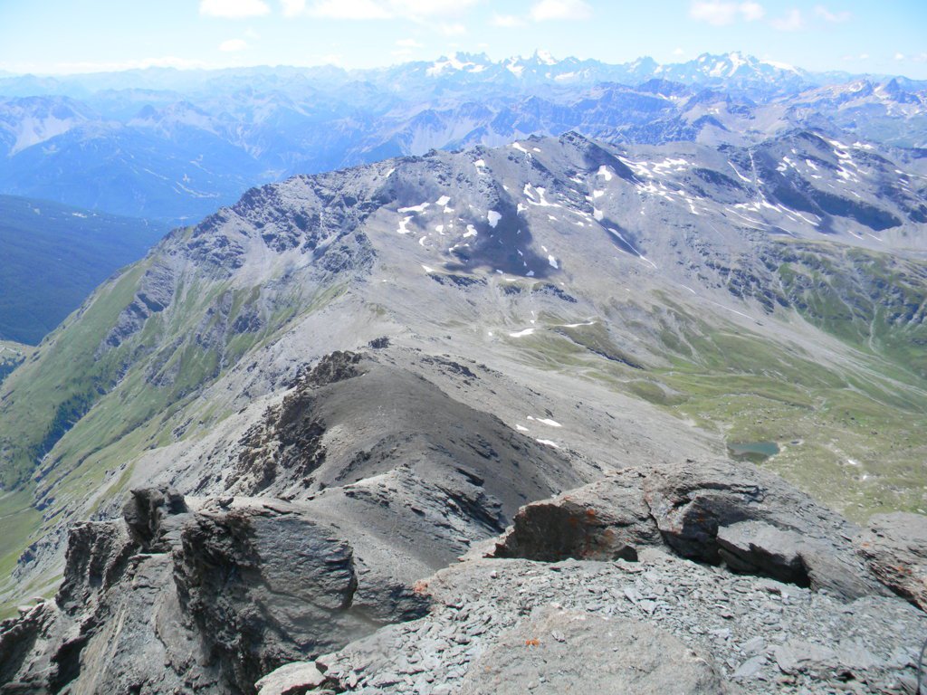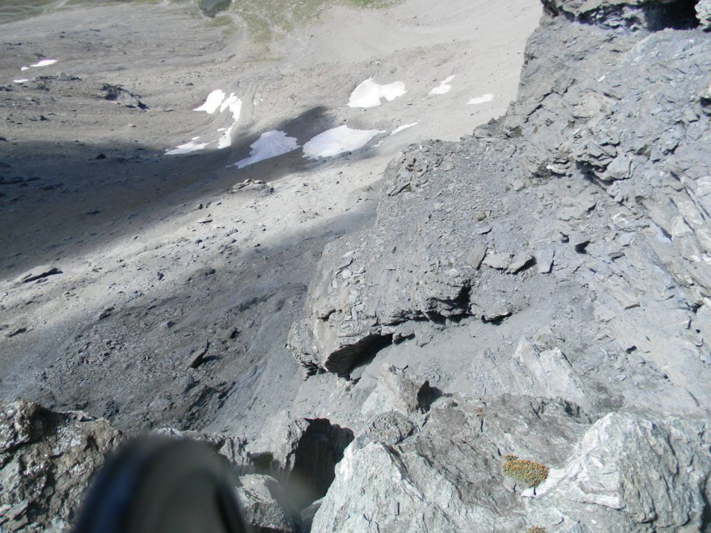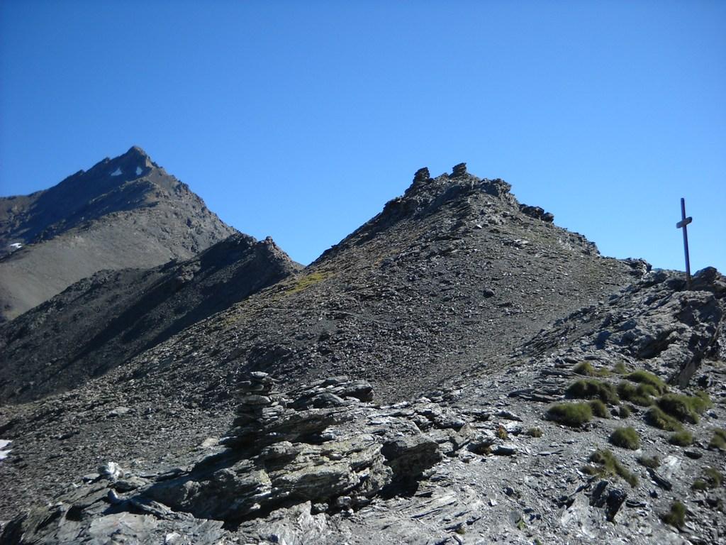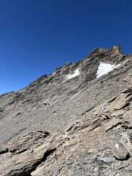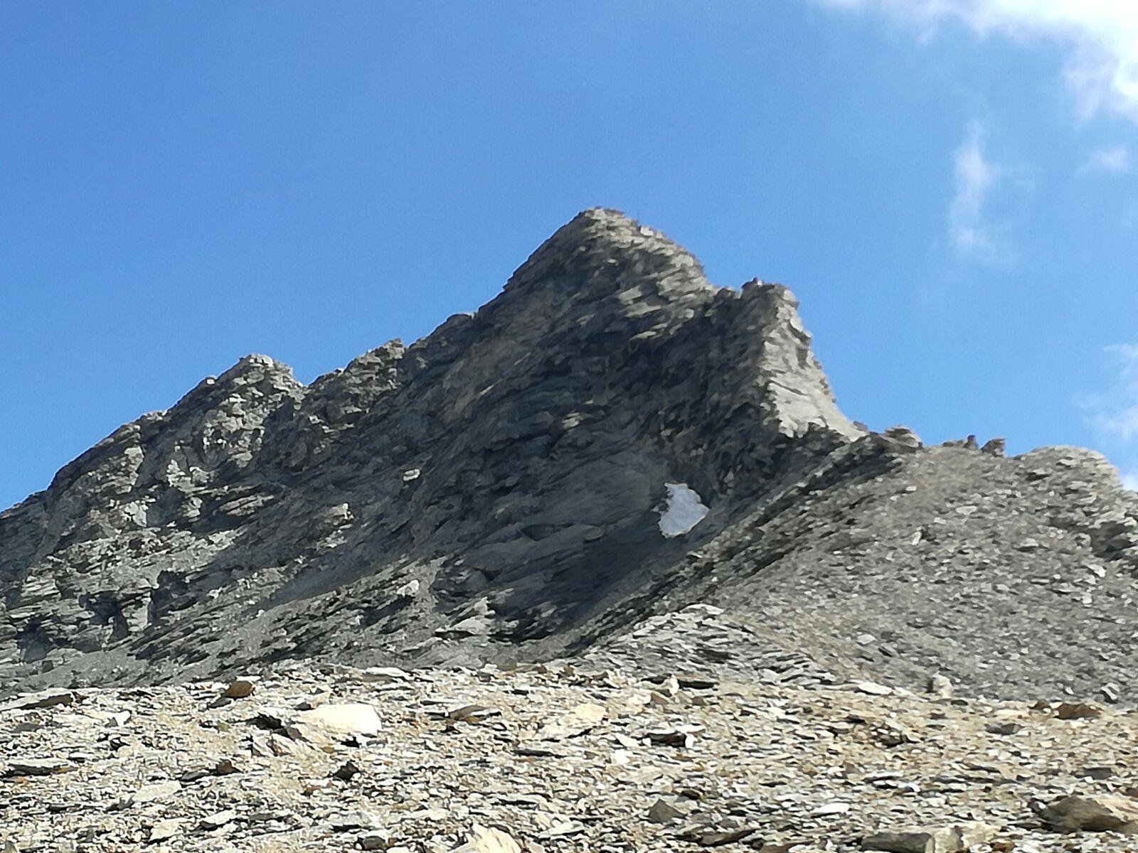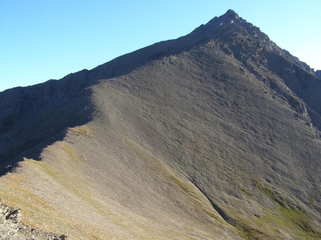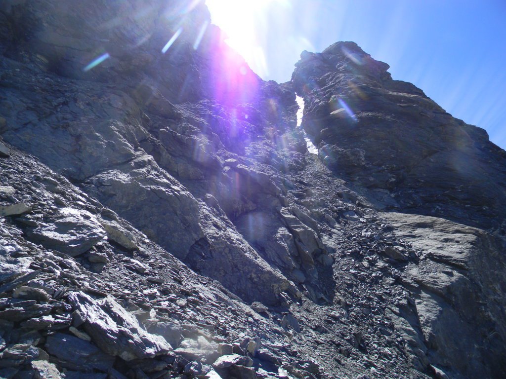 Raggiunto il colle, proseguire a destra percorrendo la lunga cresta SE: il sentiero è ben marcato e segnalato da ometti di pietra. Alla quota di circa 3250 – 3300 m si deve lasciare la cresta SO per raggiungere la cresta NO, attraversando l’immensa pietraia che scende lungo il versante ovest. Purtroppo la traccia per l’attraversamento è quasi invisibile a causa della forte instabilità della pietraia, che cancella rapidamente i segni di passaggio umano. Non fatevi tentare da una traccia segnalata da ometti a quota decisamente inferiore (a causa della nebbia l’abbiamo imboccata per errore): quella giusta comincia in un punto a non più di una quarantina di metri di dislivello dall’evidente parete giallastra che sbarra l’accesso alla vetta lungo la cresta SO.