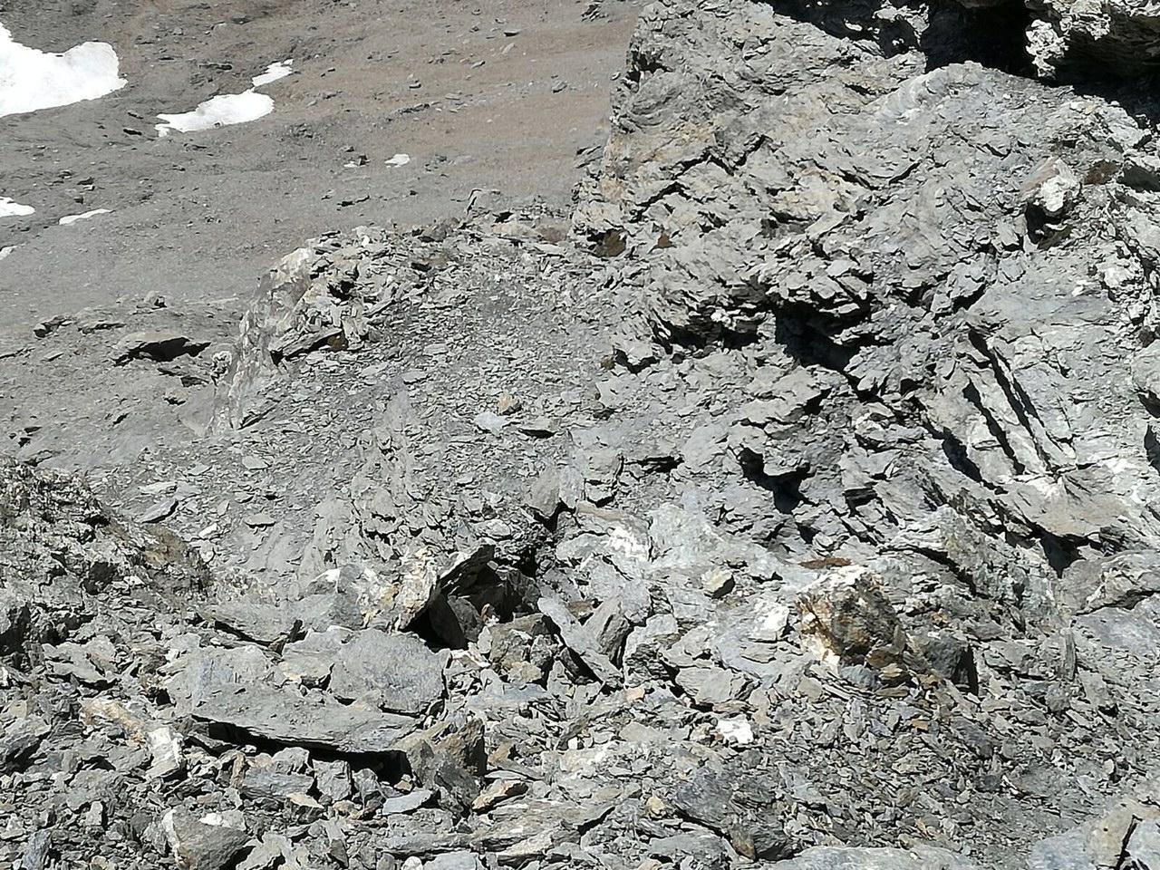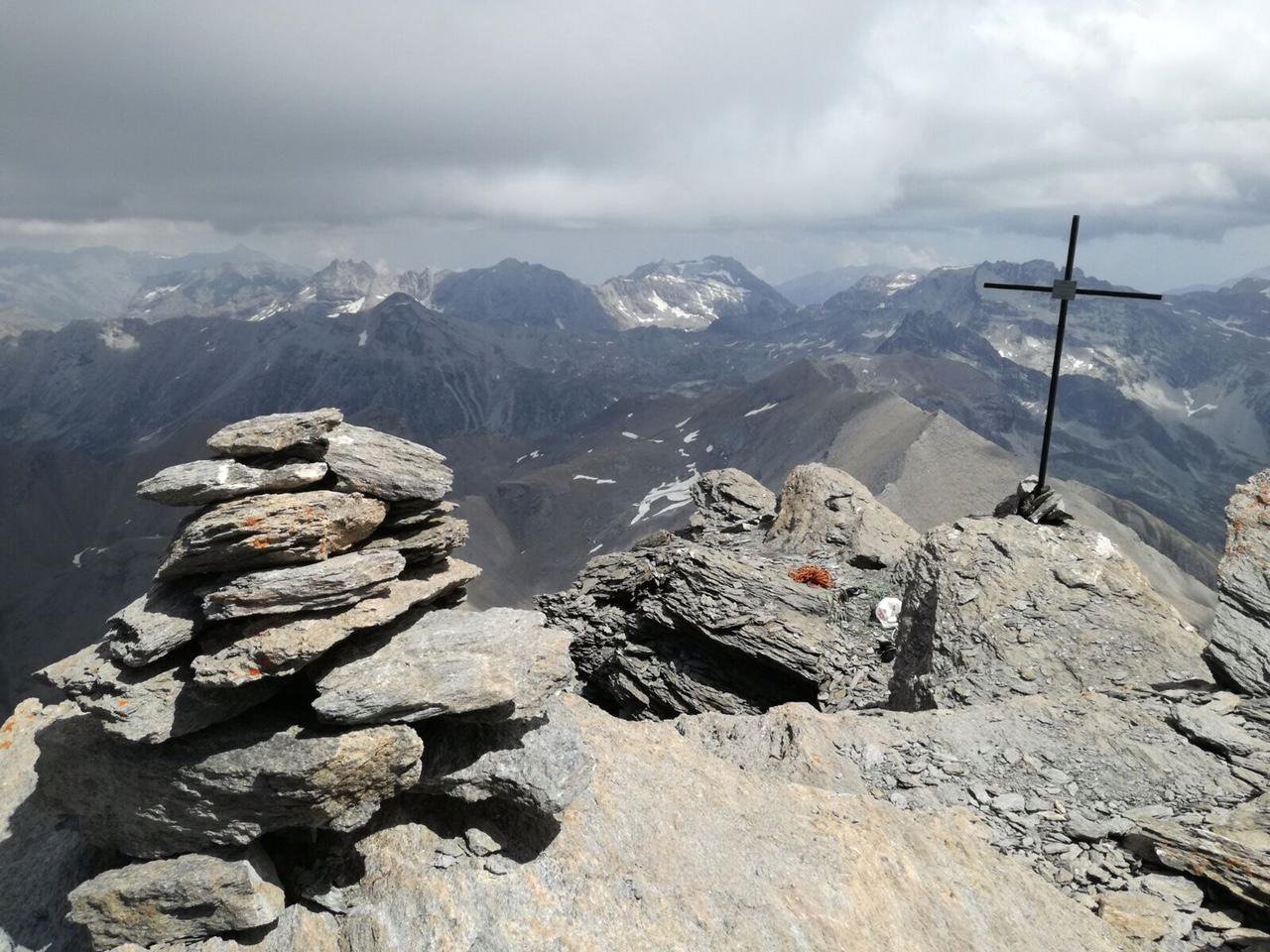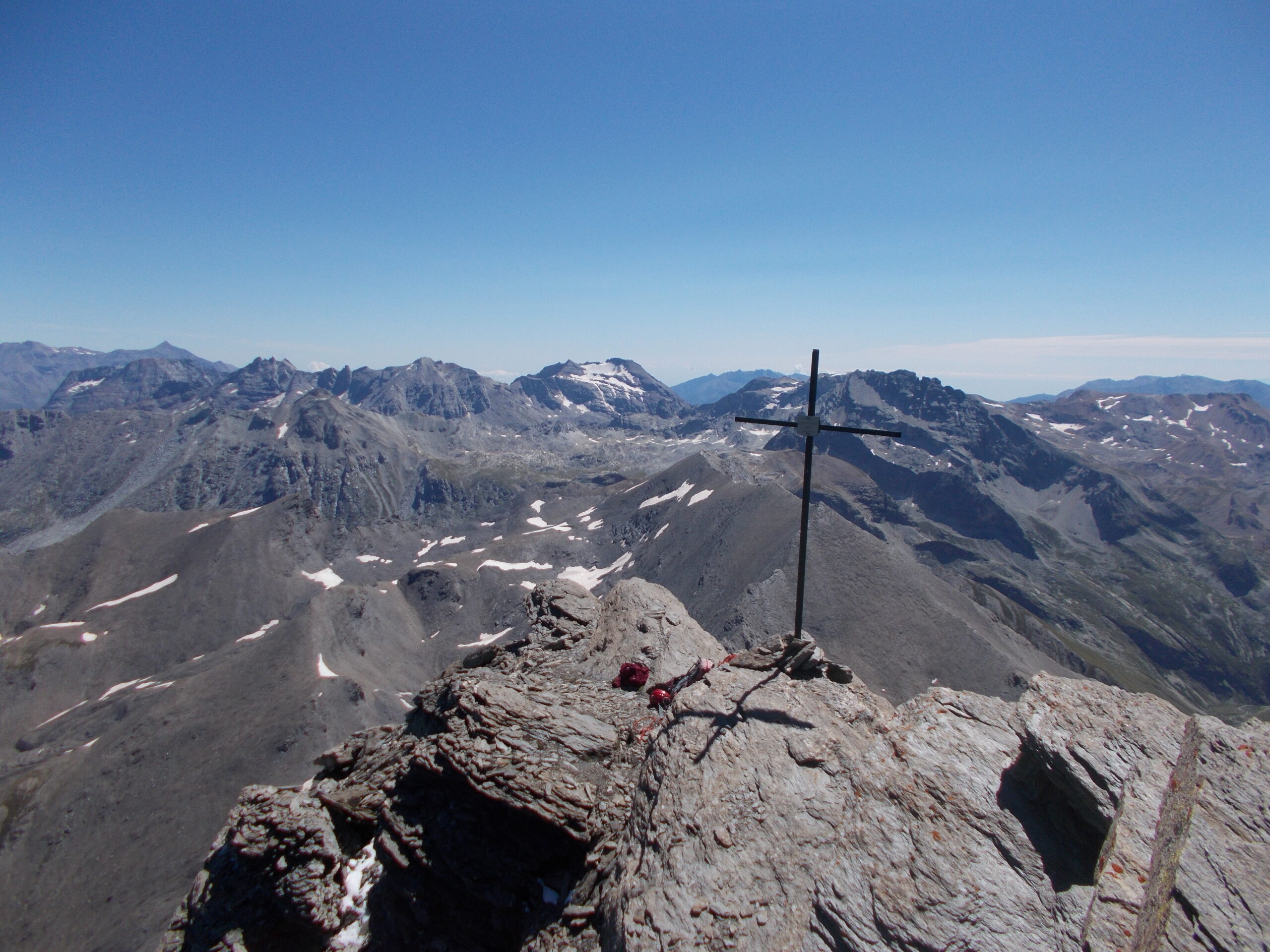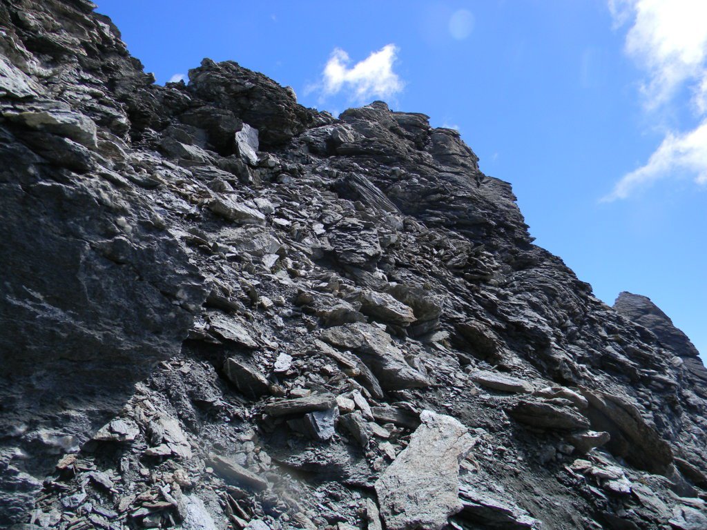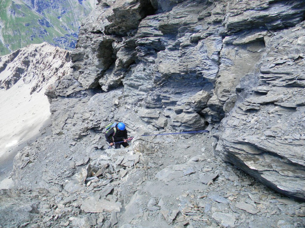 Raggiunto il colle, proseguire a destra percorrendo la lunga cresta SE: il sentiero è ben marcato e segnalato da ometti di pietra. Alla quota di circa 3250 – 3300 m si deve lasciare la cresta SO per raggiungere la cresta NO, attraversando l’immensa pietraia che scende lungo il versante ovest. Purtroppo la traccia per l’attraversamento è quasi invisibile a causa della forte instabilità della pietraia, che cancella rapidamente i segni di passaggio umano. Non fatevi tentare da una traccia segnalata da ometti a quota decisamente inferiore (a causa della nebbia l’abbiamo imboccata per errore): quella giusta comincia in un punto a non più di una quarantina di metri di dislivello dall’evidente parete giallastra che sbarra l’accesso alla vetta lungo la cresta SO.