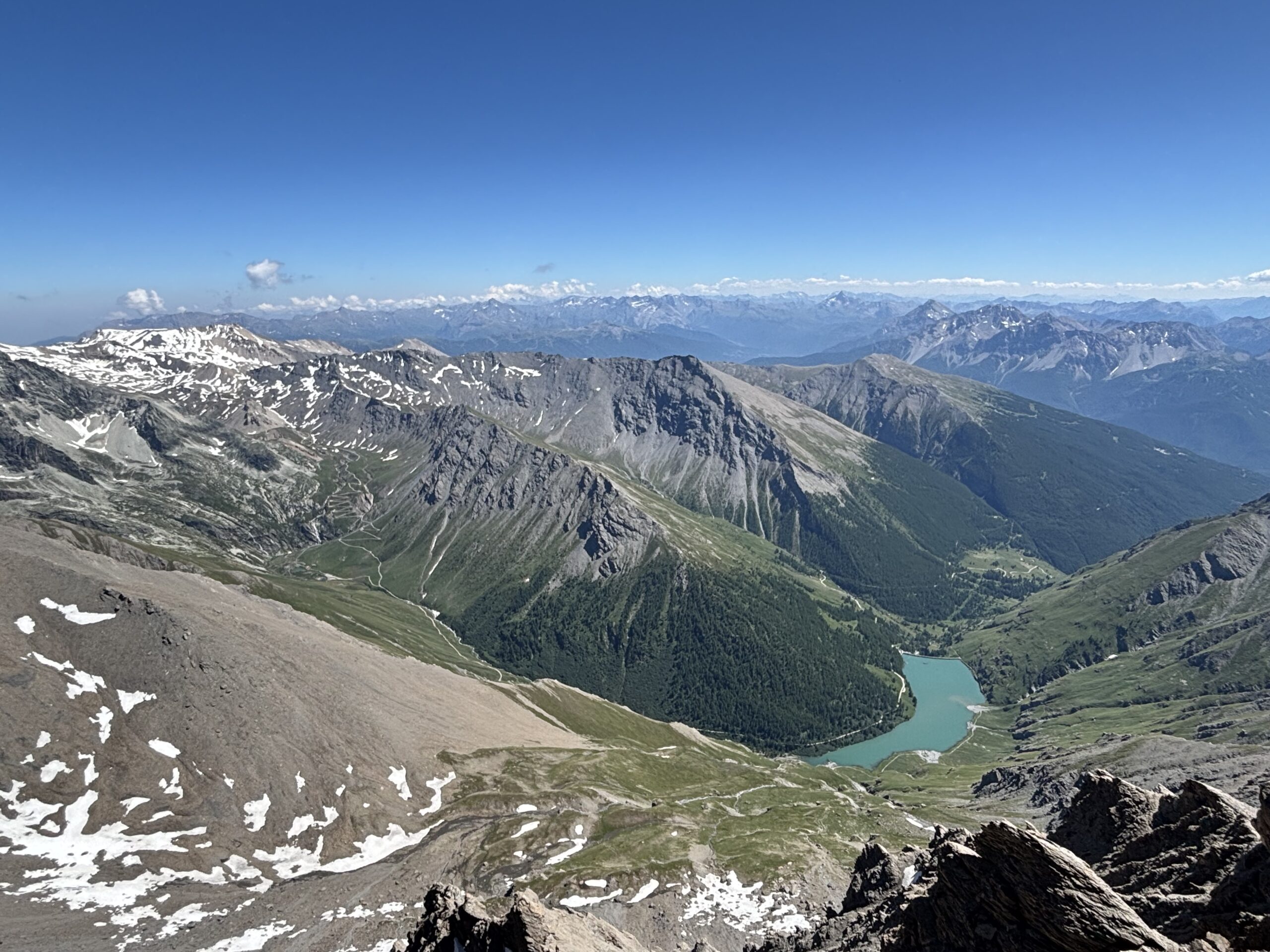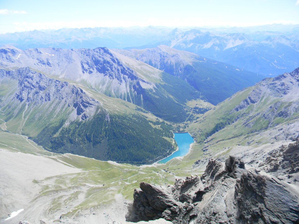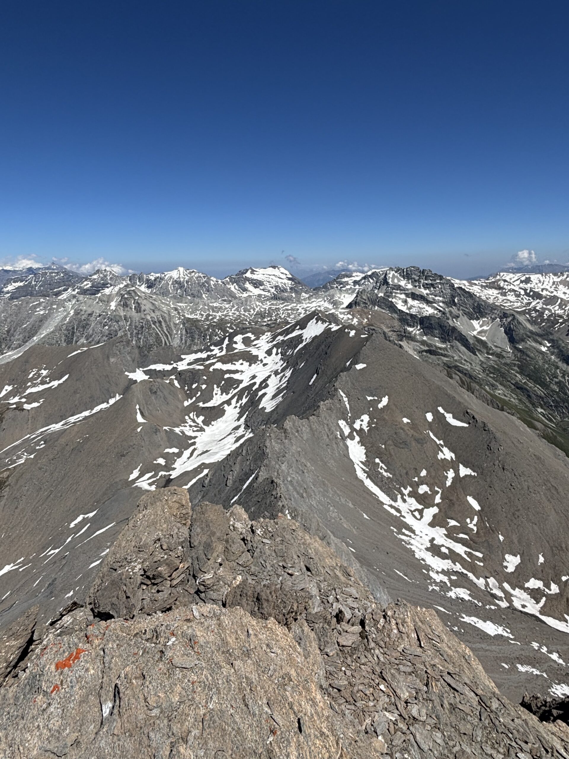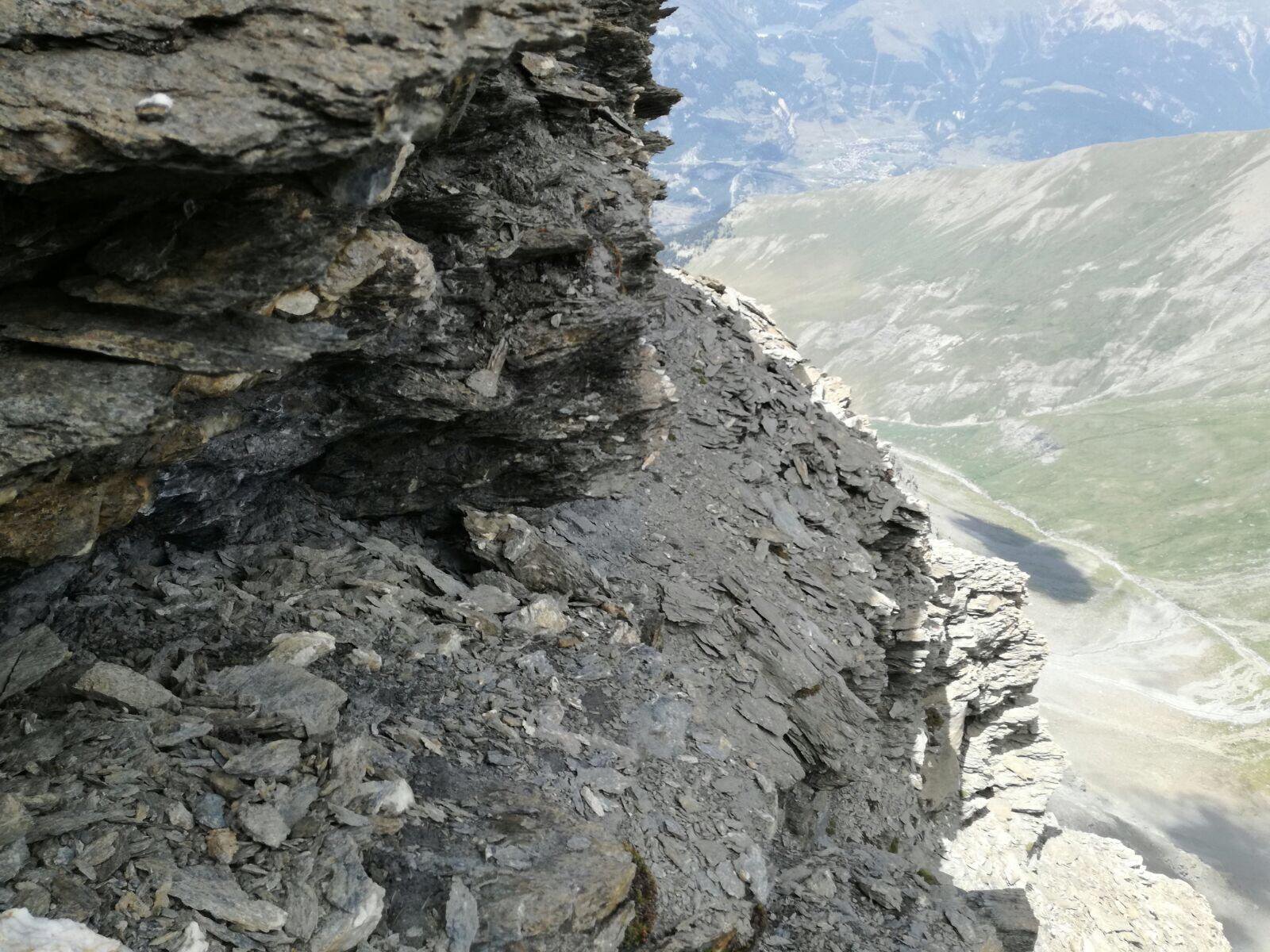 Raggiunto il colle, proseguire a destra percorrendo la lunga cresta SE: il sentiero è ben marcato e segnalato da ometti di pietra. Alla quota di circa 3250 – 3300 m si deve lasciare la cresta SO per raggiungere la cresta NO, attraversando l’immensa pietraia che scende lungo il versante ovest. Purtroppo la traccia per l’attraversamento è quasi invisibile a causa della forte instabilità della pietraia, che cancella rapidamente i segni di passaggio umano. Non fatevi tentare da una traccia segnalata da ometti a quota decisamente inferiore (a causa della nebbia l’abbiamo imboccata per errore): quella giusta comincia in un punto a non più di una quarantina di metri di dislivello dall’evidente parete giallastra che sbarra l’accesso alla vetta lungo la cresta SO.