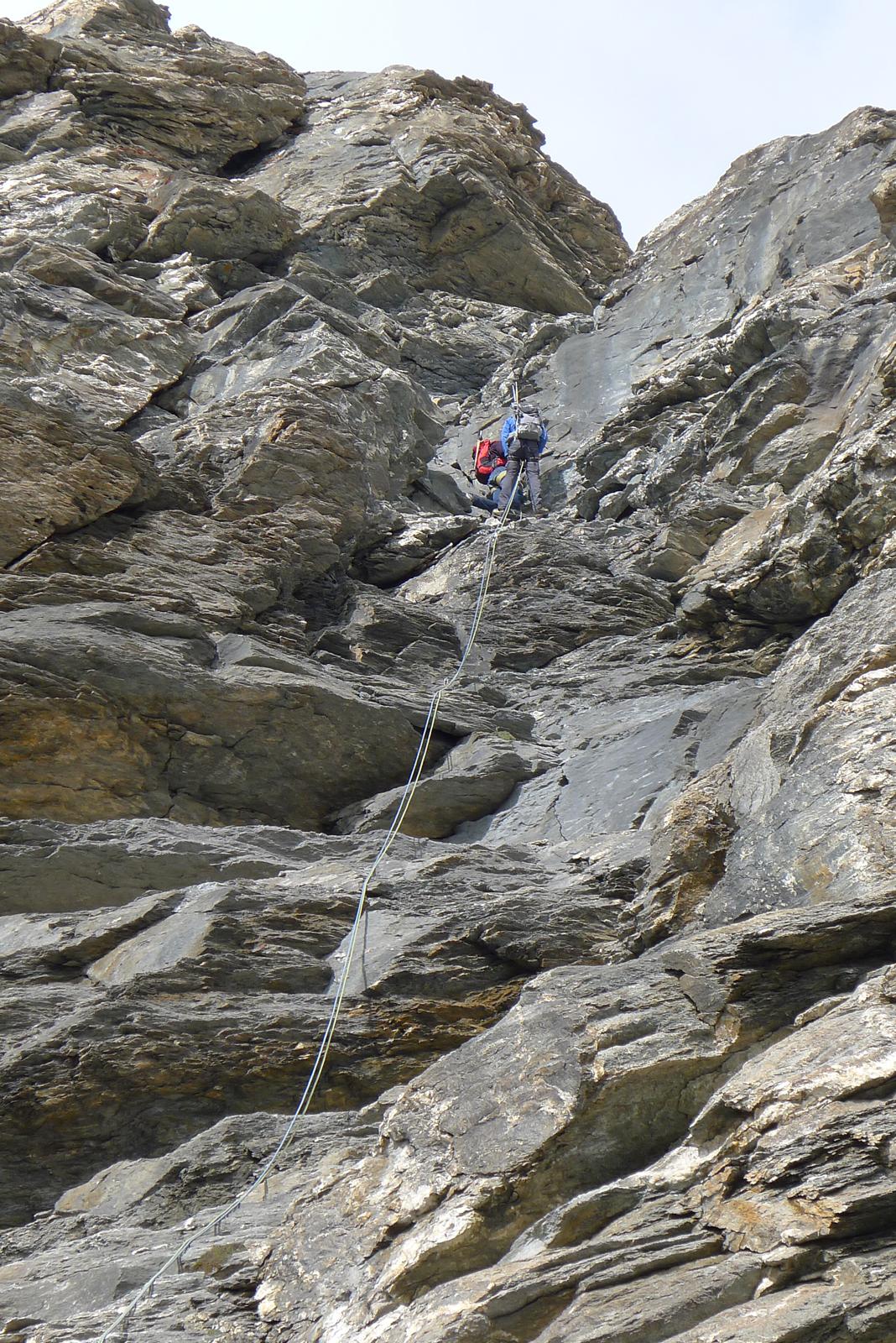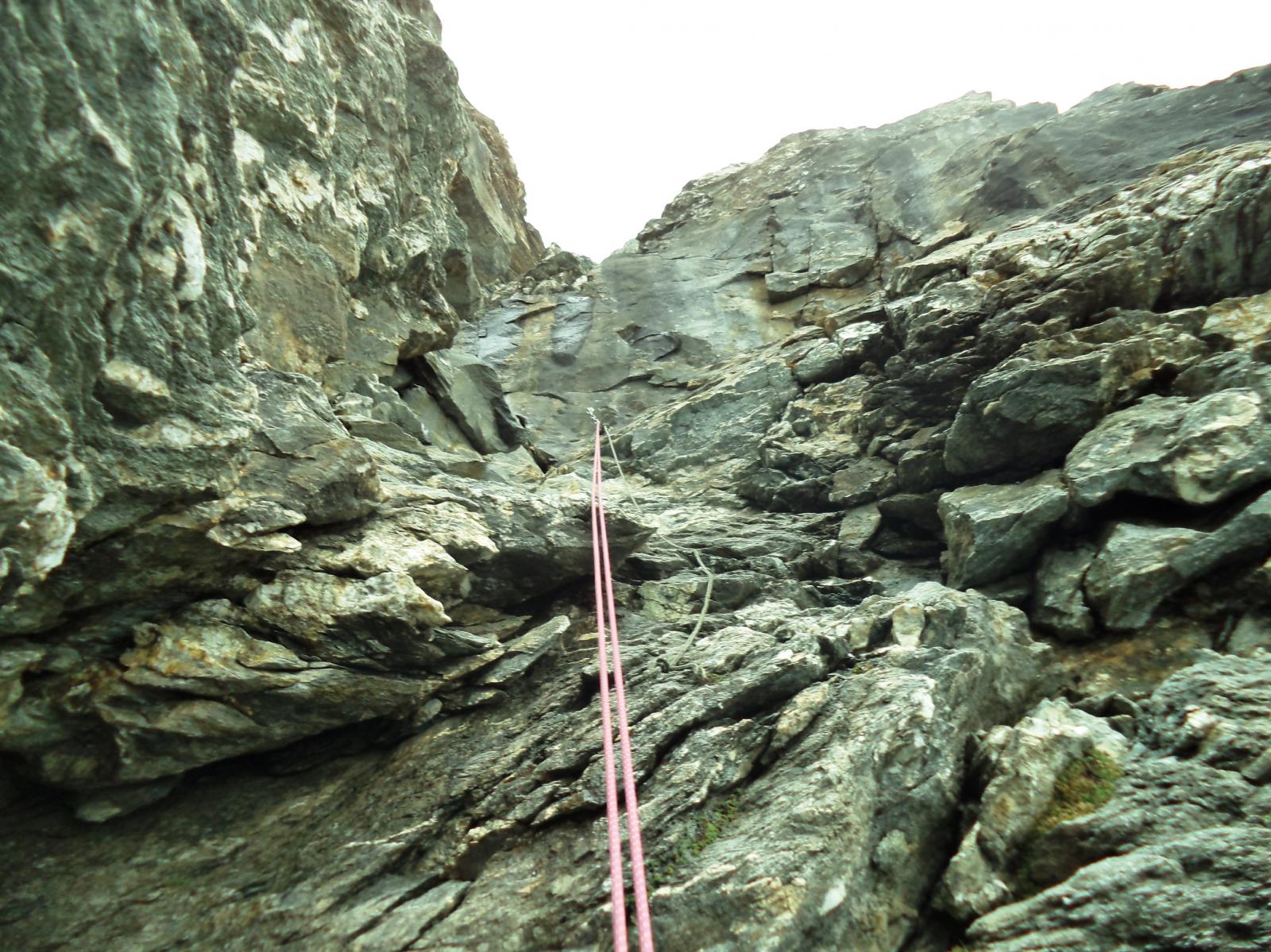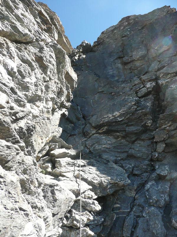 Proseguire in questo modo fino ad incontrare uno stretto canalone attrezzato con un vecchio chiodo, due soste a fix e una vecchia corda. Risalire il canalone per circa 20 m e proseguire fino a guadagnare nuovamente la cresta NO. Oltepassata la cresta, una cengia obliqua sul versante nord conduce in 15 minuti alla vetta.