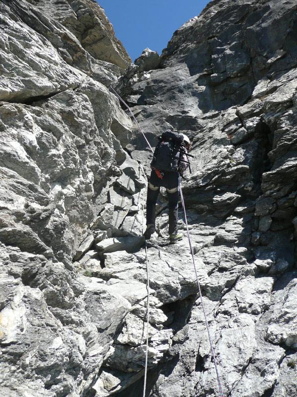 2) il tratto alpinistico in cui si devono usare le mani è molto breve (non più di 50 m dislivello), la difficoltà è bassa, ma l’esposizione e la qualità della roccia rendono