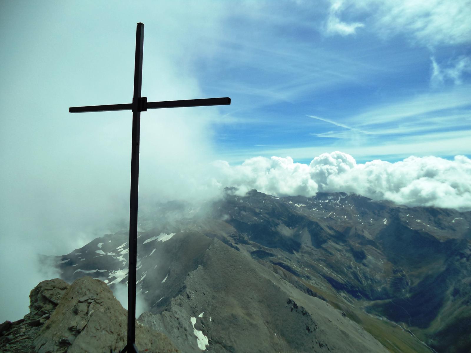 Nessun problema fino al passo della Pelouse (sentiero sempre evidente, nell’ultima parte sono presenti delle vecchie catene abbastanza affidabili). La traccia lungo la cresta SW dopo il passo Belapore si divide: o si sta alti in cresta scavalcando i vari torrioni (consigliato in salita, max II) o si perde un po’ di quota e si traversa bassi evitando le difficoltà su sfasciumi (meglio in discesa). Ovviamente invece che tagliare a sx nel tetro versante W ho sbagliato tirando dritto fin sotto al pilastro giallo, poco male passando sotto al primo nevaio per sfasciumi instabili mi sono ricollegato alla labilissima traccia che porta sotto al secondo nevaio e quindi all’attacco del canale. Qui ho commesso il secondo errore: invece che prendere il canale giusto più a sx (guardando bene si vedono delle corde) ho preso quello subito a dx forviato da un vecchio chiodo con cordino, ovviamente non me ne sono accorto subito (anche se la totale assenza di chiodi, figuriamoci poi di soste a spit, e le difficoltà maggiori rispetto a quelle dichiarate mi avevano già messo sul “chi va là”) ma in uscita sulla cresta NW dove inizia la cengia finale. Rocce quasi sempre bagnate e in alcuni punti anche verglassate da trattare con attenzione anche per la loro qualità. Cengia finale per fortuna solo viscida e bagnata ma senza ghiaccio (al ritorno al passo ho incontrato 3 ragazzi che nelle scorse settimane avevano rinunciato proprio lì per ghiaccio). Ovviamente in cima nuvoletta fantozziana che mi ha privato del panorama. Libro di vetta completamente zuppo. In discesa ho finalmente trovato il canale giusto che presenta 2 soste a spit e 2 tasseli singoli con tanto di cordoni, io visto il viscidume generale ho fatto doppie a manetta fino al fondo (se ci si cala solo dalle soste a spit ci vuole una corda almeno da 40m). In discesa la traccia per la cresta SW è un po’ più evidente, io comunque ho provato a rifare qualche ometto e ho segnalato meglio dove bisogna lasciare la cresta per attraversare il versante W (un po’ di ometti e una freccia/scritta su una placca).