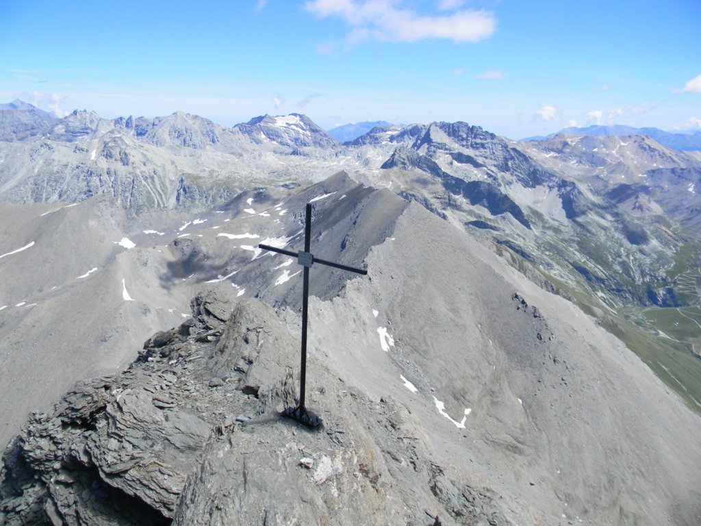 La spalla SW che dal basso pare valicabile non difficile invece lo è!!! Sembra continua e non lo è affatto bisogna saliscendere più volte, con difficoltà sostenute causa esposizione sporco detritico e fragilità della roccia, richiede autonomia alpinistica molto elevata.