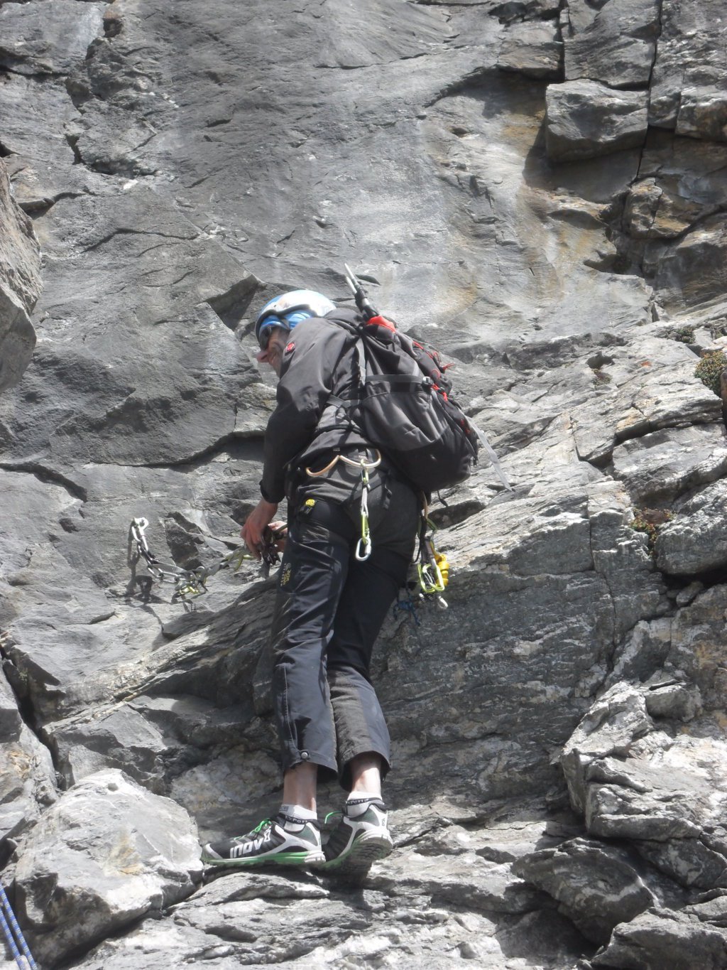 La via normale, vari ometti ma abbastanza confondibili, non ha arrampicata continuativa( se lo diviene significa che si ha sbagliato itinere, cosa molto facile )se non in alcuni brevi punti, passaggi che non superano il II°, seppur abbastanza esposti(talvolta) e sporchi di detriti di ogni tipo, non servono scarpette, bastano pedole da escursionismo, ora tantomeno ramponi e picozza. Obbligatorio il casco e la corda per calarsi, necessariamente, dalla prima per una ventina di metri al max( con una da quaranta si è tranquilli).