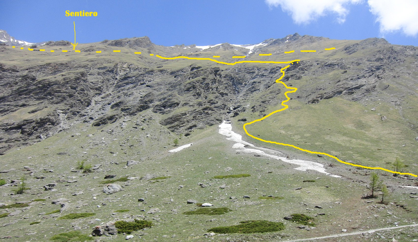 Dal ponte del Picreaux (poco dopo la Diga di Rochemolles) salire appena a destra di un rigagnolo con depositi di valanga che si origina dalla bastionata superiore e che scarica appena al di sotto del ponte. Giunti nei pressi della bastionata proseguire su pendii più sostenuti seguendo tracce di animali, tenendosi leggermente a destra e continuare a salire fino a giungere nei pressi di un pronunciato spuntone arrotondato; salire passando appena alla sua sinistra fino a giungere alla selletta sopra di esso (un passo all’uscita da fare con attenzione). Proseguire brevemente su una dorsalina erbosa quindi deviare gradualmente a sinistra passando al di sopra di un distacco di frana; salire sempre verso sinistra a mezza costa su terreno sostenuto, seguendo le tracce di animali e prestando attenzione all’erba secca (consigliabili ramponcini da escursionismo) fino a raggiungere il sentiero che giunge dall’Alpe d’Etiache. Proseguire sul sentiero in piano a sinistra e raggiungere il punto dove questo inizia la salita a svolte e dove generalmente inizia la neve.