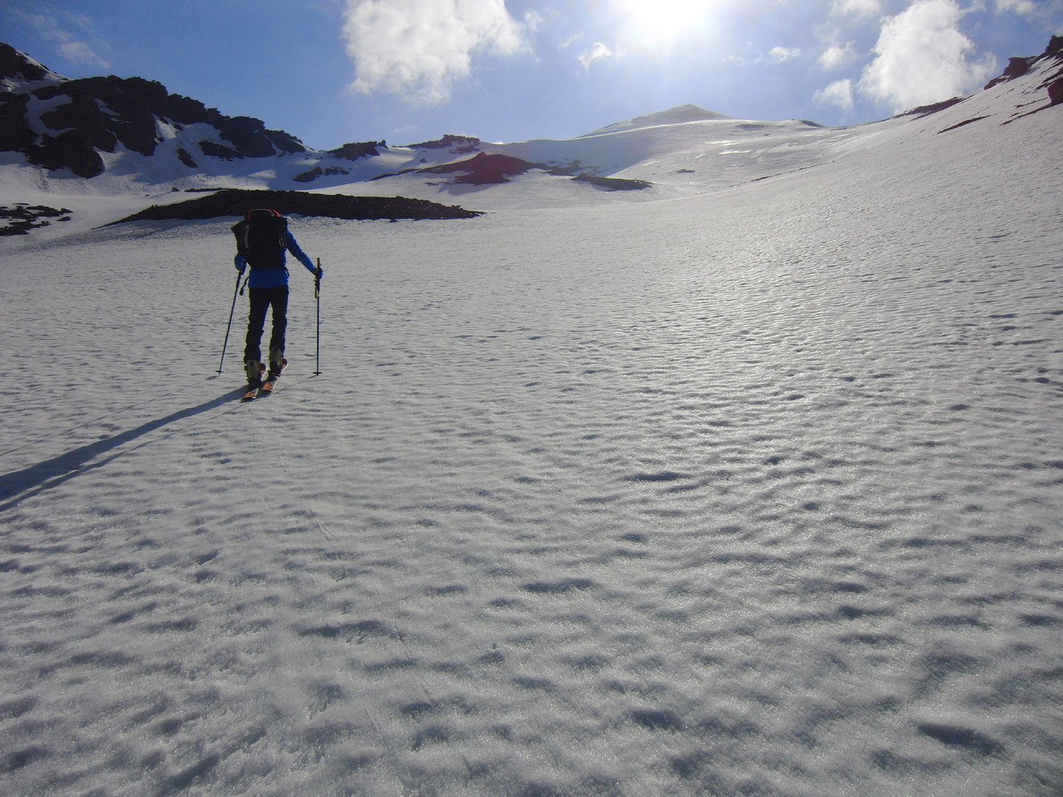 Calzare gli sci e salire nel vallone (tratti sostenuti e ripiano intermedio); continuare verso i pendii alti e uscire in vetta sia a sinistra che a destra (spesso nell’ultimo tratto sono necessari i ramponi).