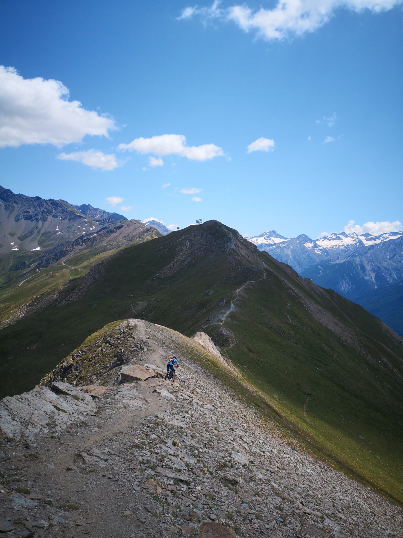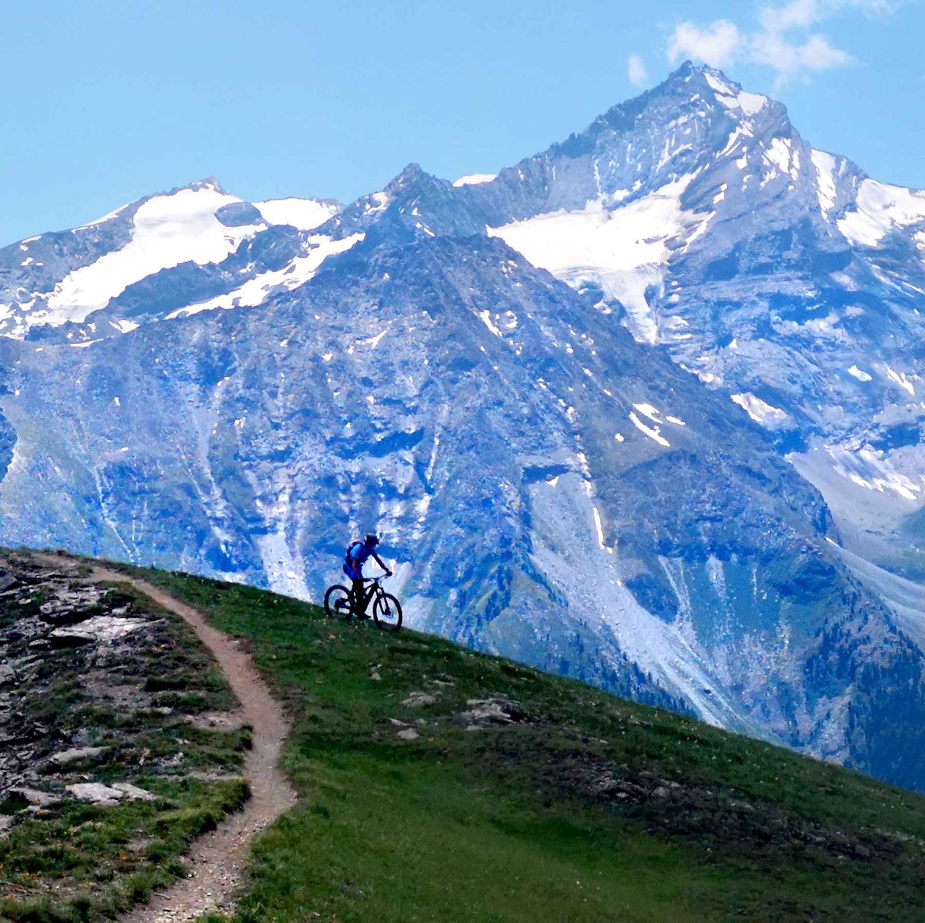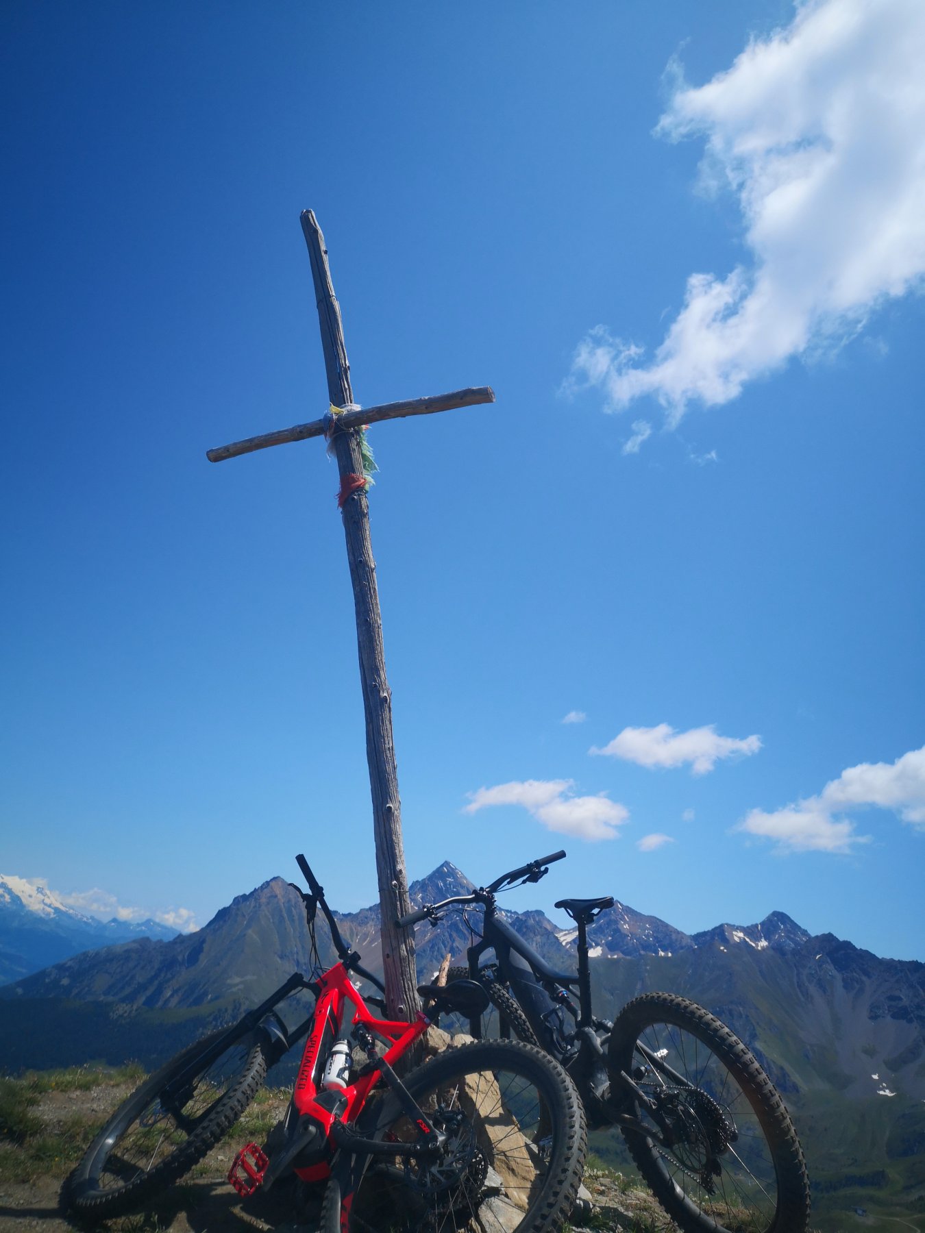 Per interpoderale e poco asfalto scendere a Ozein (1450m) e risalire su ottimo sterrato fino all’ alpeggio di Champchenille a 2200m; qui resta poco da pedalare e con pazienza spingere sino in vetta alla cima sci-alpinistica più nota della valle: punta De la Pierre a 2650m.