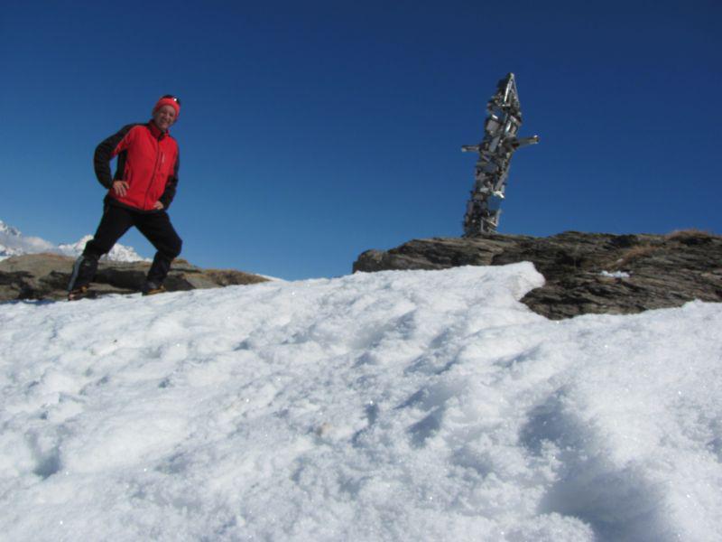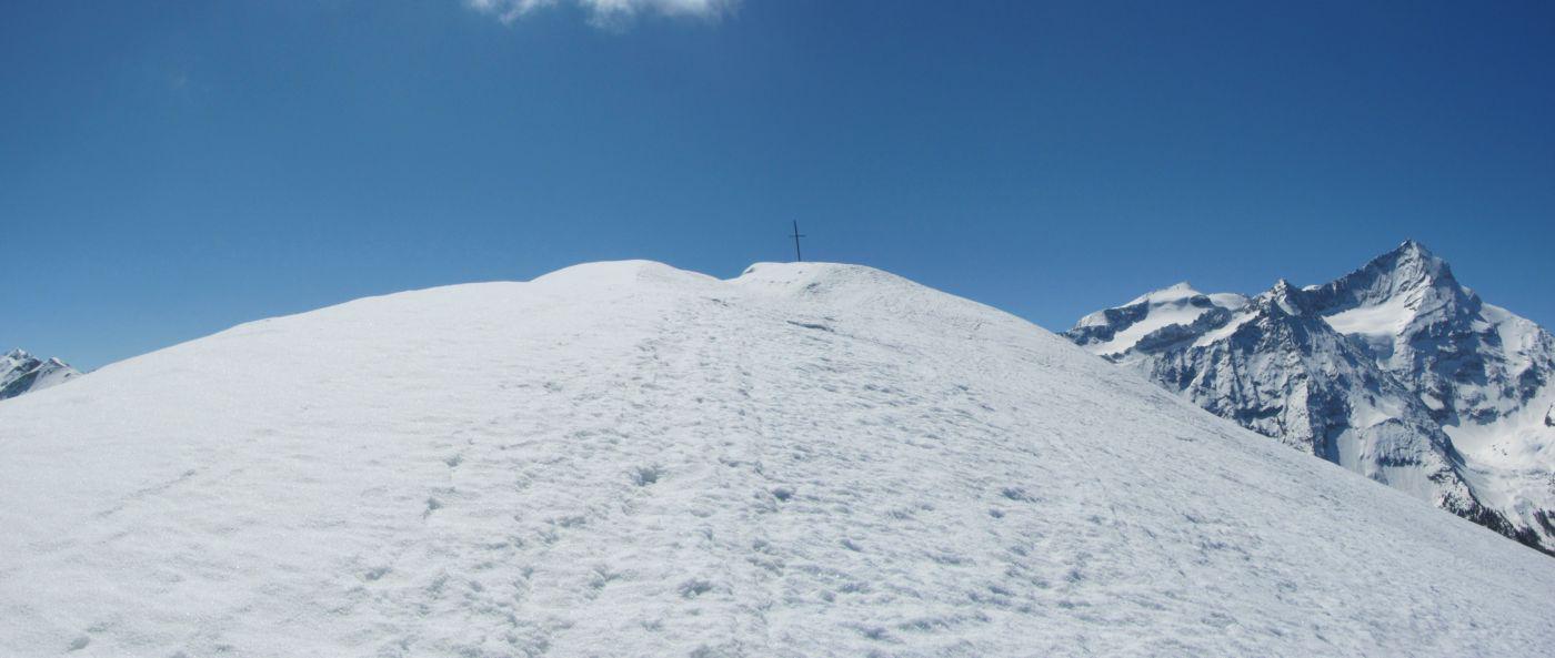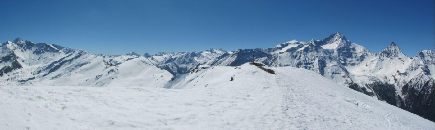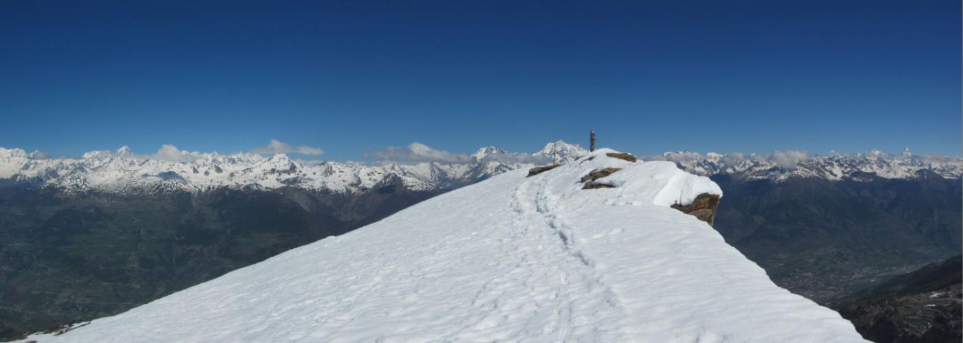 Ho seguito la sterrata (con qualche scorciatoia) fino all’alpe Champchenille dove fo trovato neve continua fino in vetta. In salita neve con crosta portante ho calzato i ramponi (per non portarmeli nello zaino, visto che avevo anche le ciaspole …) solo nell’ultimo tratto. Breve pausa in cima per ammirare lo splendido panorama: Poi sono subito sceso ma la neve si era già trasformata tanto che ho dovuto mettere le ciaspole. Nessuno in giro. Durante la discesa viste tante marmotte, una pernice e un’aquila. Come al solito bella gita anche se faticosa!!