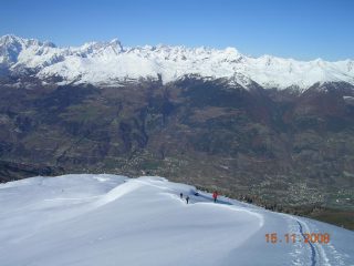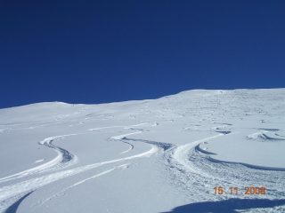 giornata incredibile, panorama mozzafiato e neve da urlo. bisogna portare gli sci per circa 250m, ma la discesa paga anche gli interessi. bella compagnia con paolo, beppe e consorte,e i due trentini indemoniati…