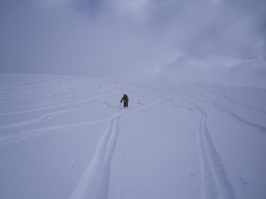 Purtroppo quando sono arrivato all’anticima ,una fitta nebbia ha coperto la zona con visibilità zero che mi ha convinto ad iniziare la discesa anzitempo(solo altri due del gruppo erano già arrivati alla vetta finale poco distante)comunque la discesa è stata divertente e poco più sotto la visibilità è tornata permettendoci di sfruttare a pieno la bella neve anche verso il basso(grazie all’ottima conoscenza della zona),la poderale l’abbiamo utilizzata solo per le ultime tre curve.