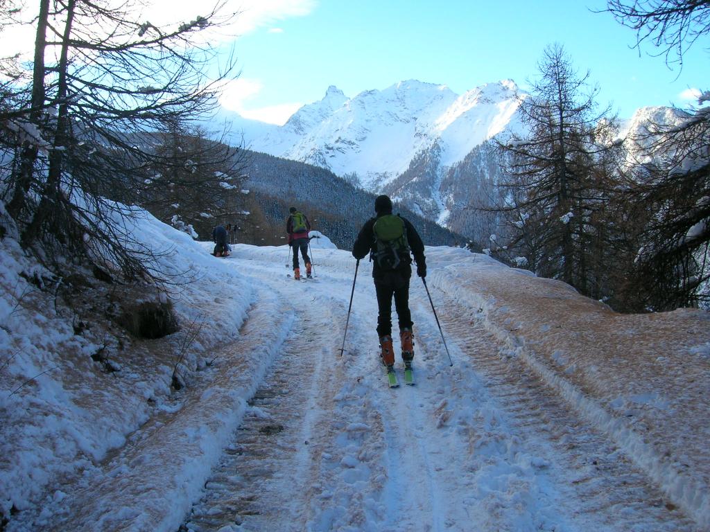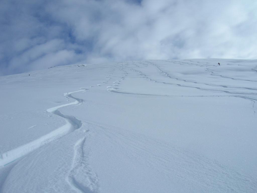 Partenza 9.15 con -5 e cielo sereno.In basso pochissima neve (10cm) e pietre affioranti sulla strada.Fino a 2000m nn più di 20 cm poi nel bosco soprastante la situazione cambia decisamente con circa 50-60cm che diventano quasi 1mt nel plateau sommitale.Traccia ottima.Discesa iniziata alle 11.40 con visibilità ottima e pendii ancora vergini con 7-8 tracce,neve farinosa asciutta su tutto il percorso molto bella.A champchenille ripellato e tornati in vetta ma la visibilità alla mezza era molto scarsa e buona parte del pendio alto tutto arato,solo da metà in giù si sono trovati spazi intonsi,il divertimento sto giro è stato molto poco peccato perchè la neve era uno spettacolo oggi.Da quota 2000 si tocca di tutto,rami,pietre,terra..meglio una volta usciti dal bosco prendere subito la strada e seguirla fino a sotto.Tanti skialp sul percorso,visto anke che era una delle poche zone col bello stamattina.