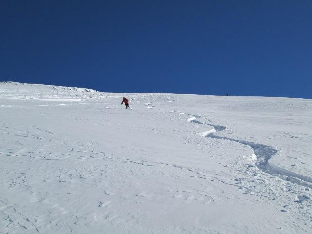 Pendio finale stupendo…per fortuna sono scesi tutti nella zona già tracciata, quindi è bastato spostarsi di 50 metri sulla sinistra (scendendo) per trovare pendii completamente vergini tutti a nostra disposizione. Scegliendo le zone meno battute dal vento si trova della farina stupenda fino alle baite e, nonostante le pendenze a tratti poco sostenute, non abbiamo quasi dovuto spingere per collegare i vari valloncelli. Dalle baite in giù abbiamo seguito la traccia di salita nei tratti di bosco fitto, mentre nelle radure siamo ancora riusciti a trovare diverse zone ancora intonse e molto divertenti, anche se dai 1800 m in giù la neve non è tanta e il terreno non è molto uniforme, e quindi bisogna fare un po’ di attenzione sennò si rischia di toccare qualcosa. Ultima parte (dai 1.650 m in giù) sulla stradina, che consente un comodo rientro arrivando sci ai piedi alle auto.