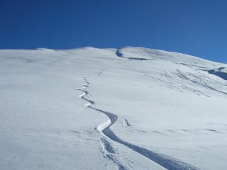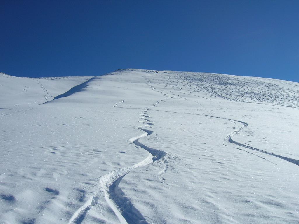 +1 alle 9 alla partenza.Neve scarsissima fino a quota 1800.Limite pioggia 1700 circa.DAi 1800 in poi sui 5-10cm di polvere fino all’ultimo alpeggio poi sui 20-25 nel plateau.Assenza di vento e poche persone.Qualche leggera brezza in cresta ultimo tratto e in vetta.Discesa strepitosa in polvere intonsa nella parte alta,ripellato e altra goduria su pendii solo per noi.Sciata molto bella fino a 1900 poi discreta per via della poca neve,numerose tracce e inizio di crosta.Dai 1800 conviene prendere al più presto la strada x mancanza di neve.