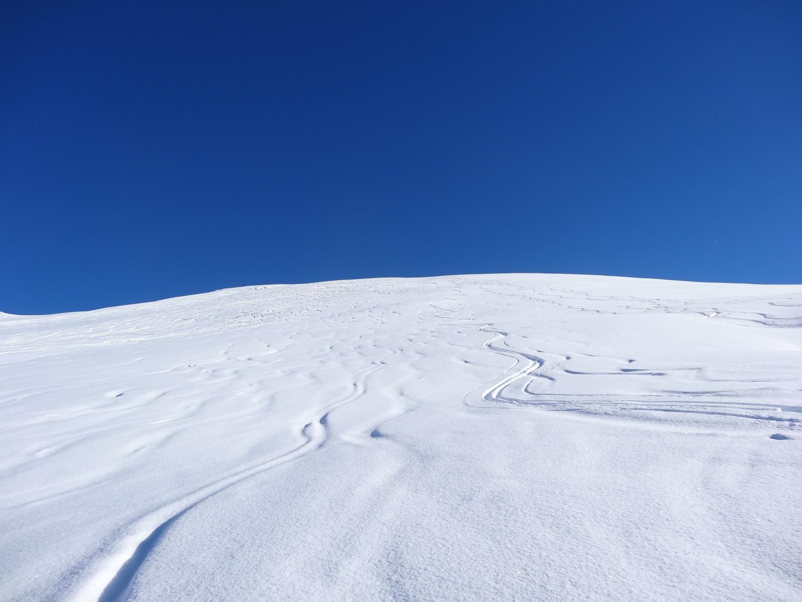 Visto la gara sono partito dal piazzale di Turlin. Battuto traccia su ottima e abbondante neve fino all’alpeggio di Romperin, dove passavano le traccie della gara. Un po’ di vento nel plateau superiore. Solo poche traccie scendevano verso sinistra, dove sono sceso, su ottima neve e in ampi spazi ancora vergini. Bella gita.