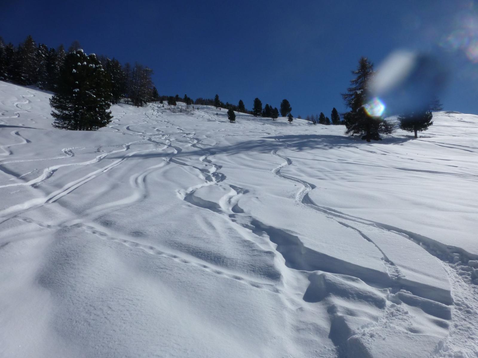 Partiti con leggero nevischio, si è gradatamente aperto il cielo. A partire dal baitone cielo blu ma vento che rinforzava sulla cresta. Noi siamo fra quelli che hanno deciso il dietrofront a 150 m dalla cima proprio per la forza del vento. Discesa fantastica in 50 cm di neve fresca sulla pala, nel bosco e nei pratoni. La Pierre non tradisce mai.