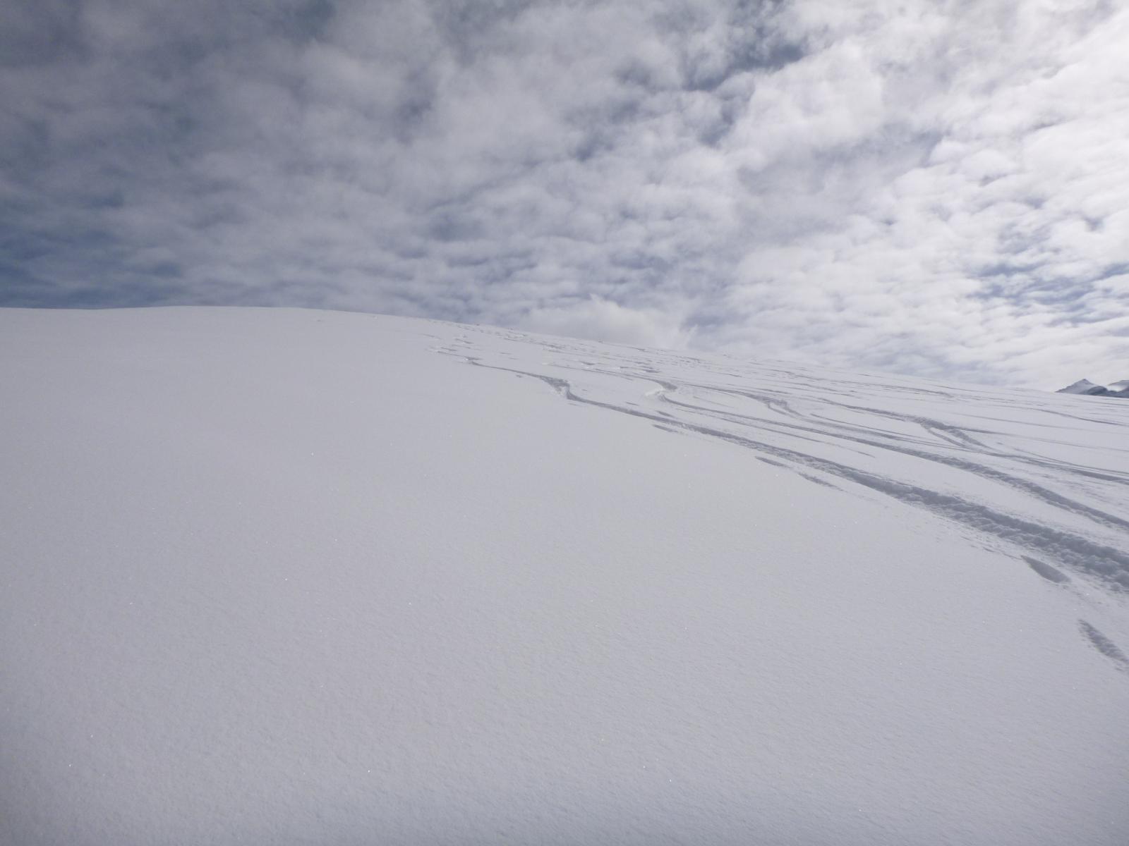 Partiti 60 m più in basso di dove indica la relazione, in corrispondenza di un piccolo parcheggio. 5-10 cm di fresca di ieri hanno coperto, ma non del tutto, le tracce di discesa degli scorsi giorni. Parte alta: siamo scesi un pò sulla destra (senso di discesa), nei pendii meno esposti al sole e abbiamo trovato spettacolare polvere e grandi spazi intonsi. Dall’alpe di quota 2200, dove inizia il bosco, la situazione cambia e si trovano tracce vecchie un pò fastidiose (mai più di tanto, comunque). In ultimo, i pendii finali, divertenti con qualche dito di neve fresca su fondo portante.
