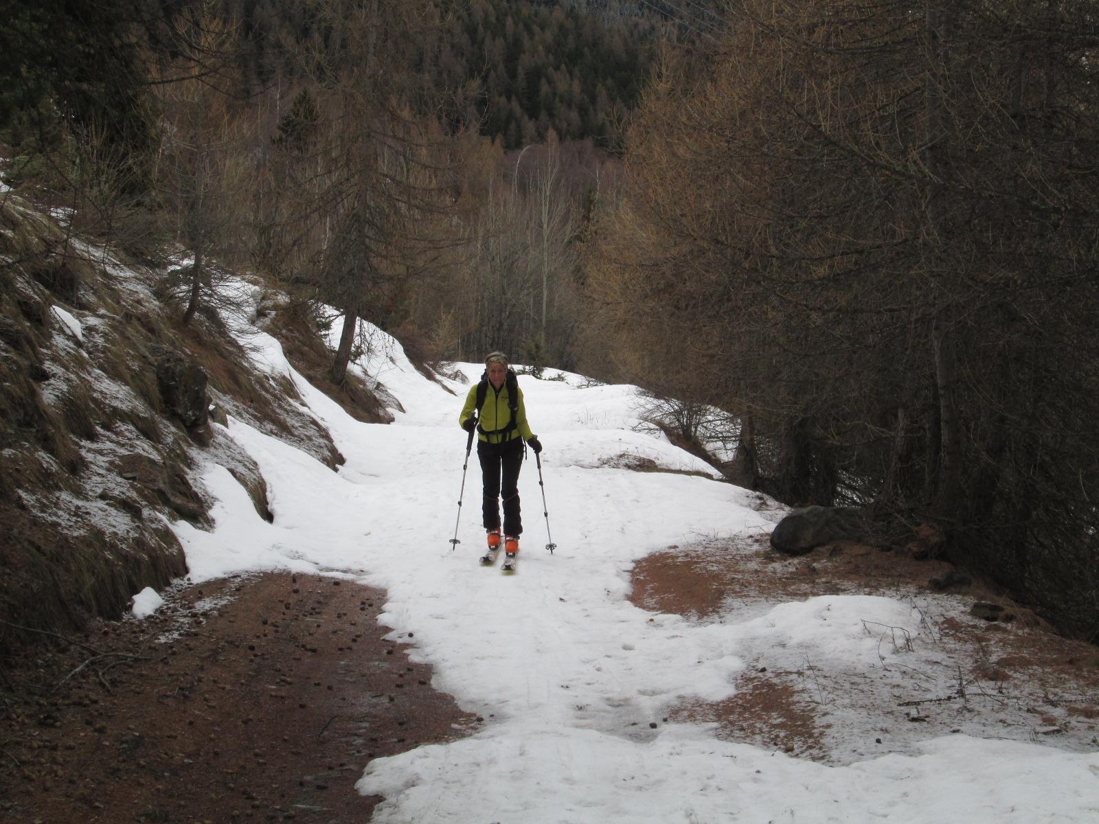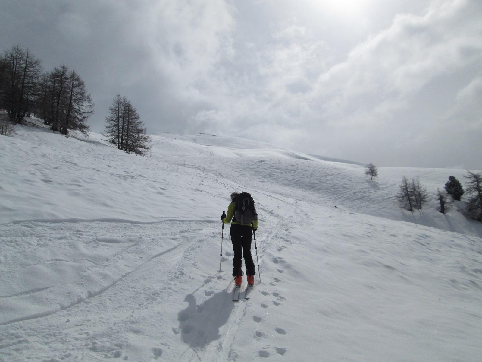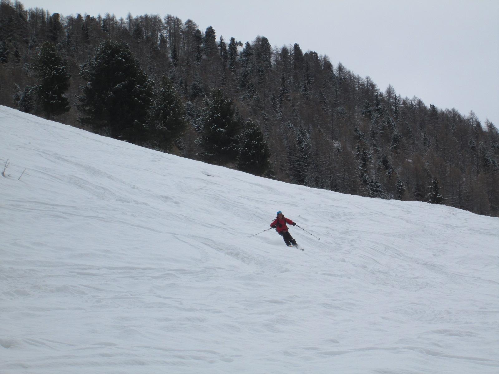Previsioni meteo un po’ incerte, e quindi gita classica e sicura. Partenza alle 8.15 dall’inizio della poderale appena dopo Daillet (temperatura intorno agli 0°). In basso la neve è poca e conviene seguire la poderale fino a 1.750 m circa, dopodichè si può abbandonare e salire un po’ più rapidamente. La nevicata di sabato ha lasciato dai 5 ai 10 cm sopra i 1.800 metri, al di sotto nulla. Dalle ultime baite traccia direttissima fatta dalle poche persone che ci hanno preceduto. Arrivati in cima intorno alle 11.45 con un vento fortissimo e gelido, che ci ha costretti a scendere immediatamente, poco male visto il cielo nuvoloso…in discesa, primi 100 metri poco sciabili sia per la visibilità non ottimale che per la neve dura e ventata che ha reso il fondo estremamente irregolare. Per il resto del plateau discesa bellissima, con 10 cm di farina su fondo duro, a patto di cercare le zone meno tracciate, in quanto la neve recente non ha ricoperto le tracce precedenti. Dalle baite Champchenille neve ancora molto bella specie nelle ampie radure tra i 2.100 e i 1.800 m. Da lì in giù la neve è poca e quindi abbiamo preferito prendere la poderale poco sotto le baite Titeun. Forse, ravanando un po’ e con qualche gava&buta si riesce a tagliare ancora un tornante arrivando sulla strada a quota 1.650 m circa, ma non so se ne vale la pena perché la stradina è molto veloce e al momento presenta solo un brevissimo tratto di 5 m senza neve.