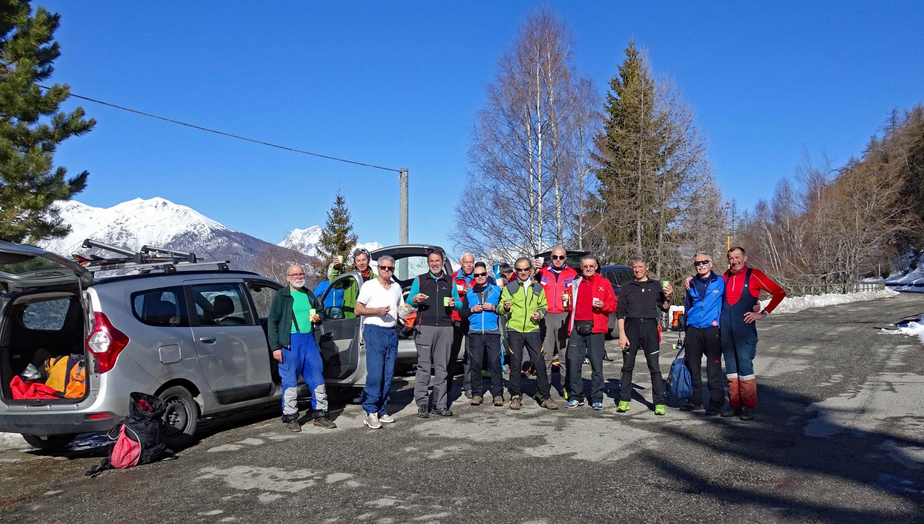 Giornata stupenda,primaverile. Insieme ad altri 16 evergreen che hanno raggiunto la meta.Io invece mi sono fermato alle baite Champchenille quota 2270 circa, da quota 1500 alla partenza.Da dove ero io in giù, neve piuttosto crostosa quindi dopo alcuni tentativi “off road” sono sceso per la stradina.