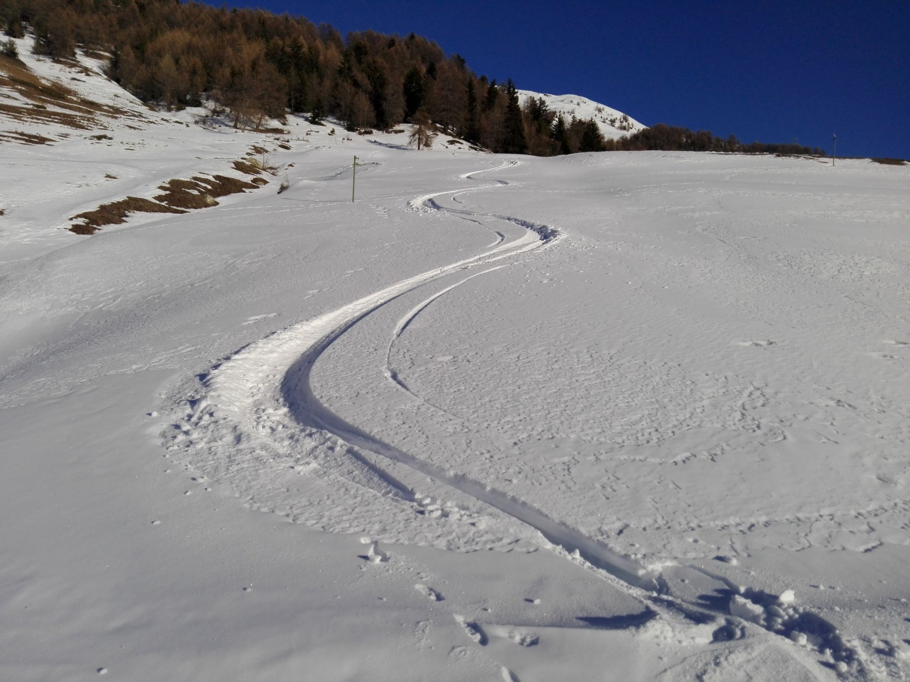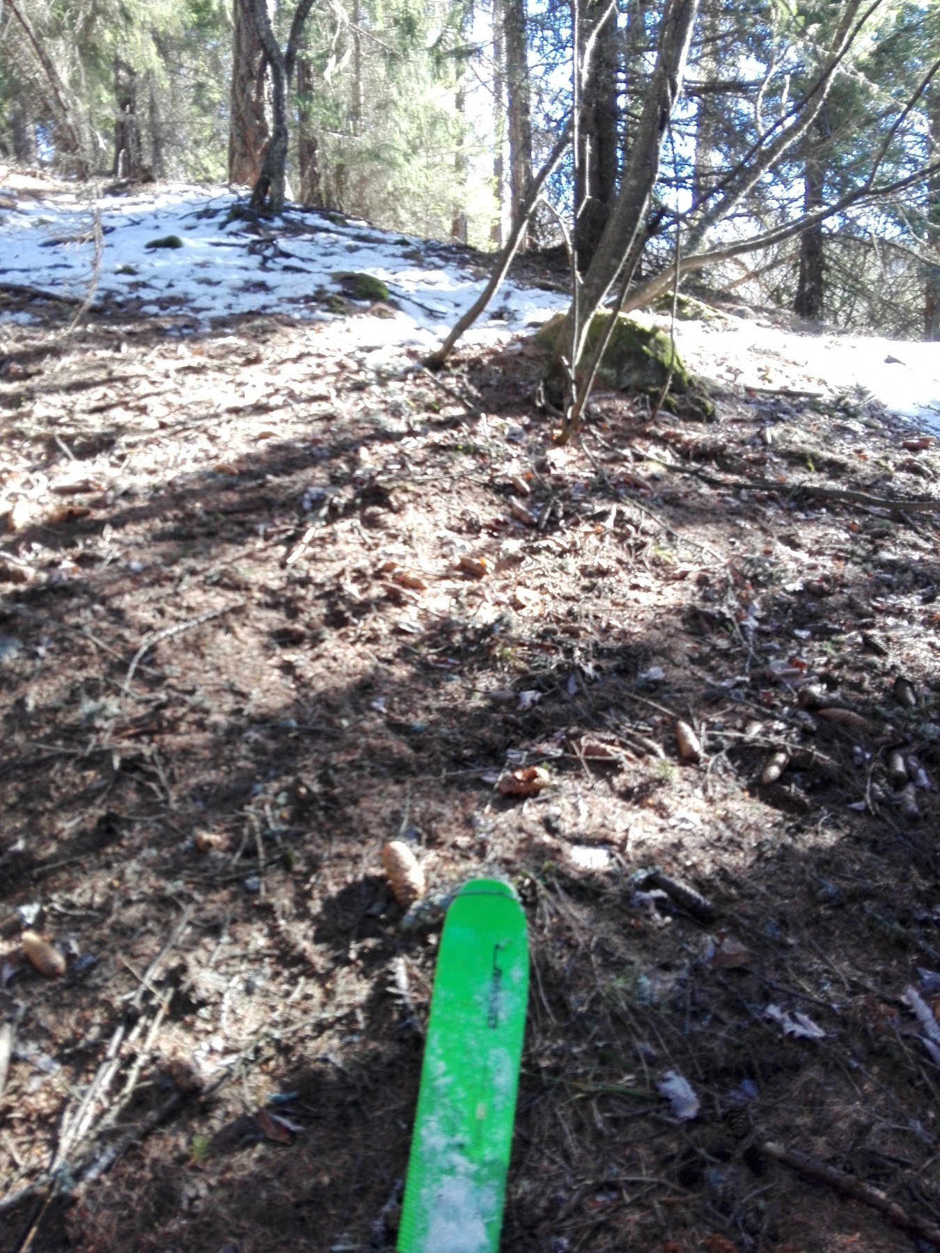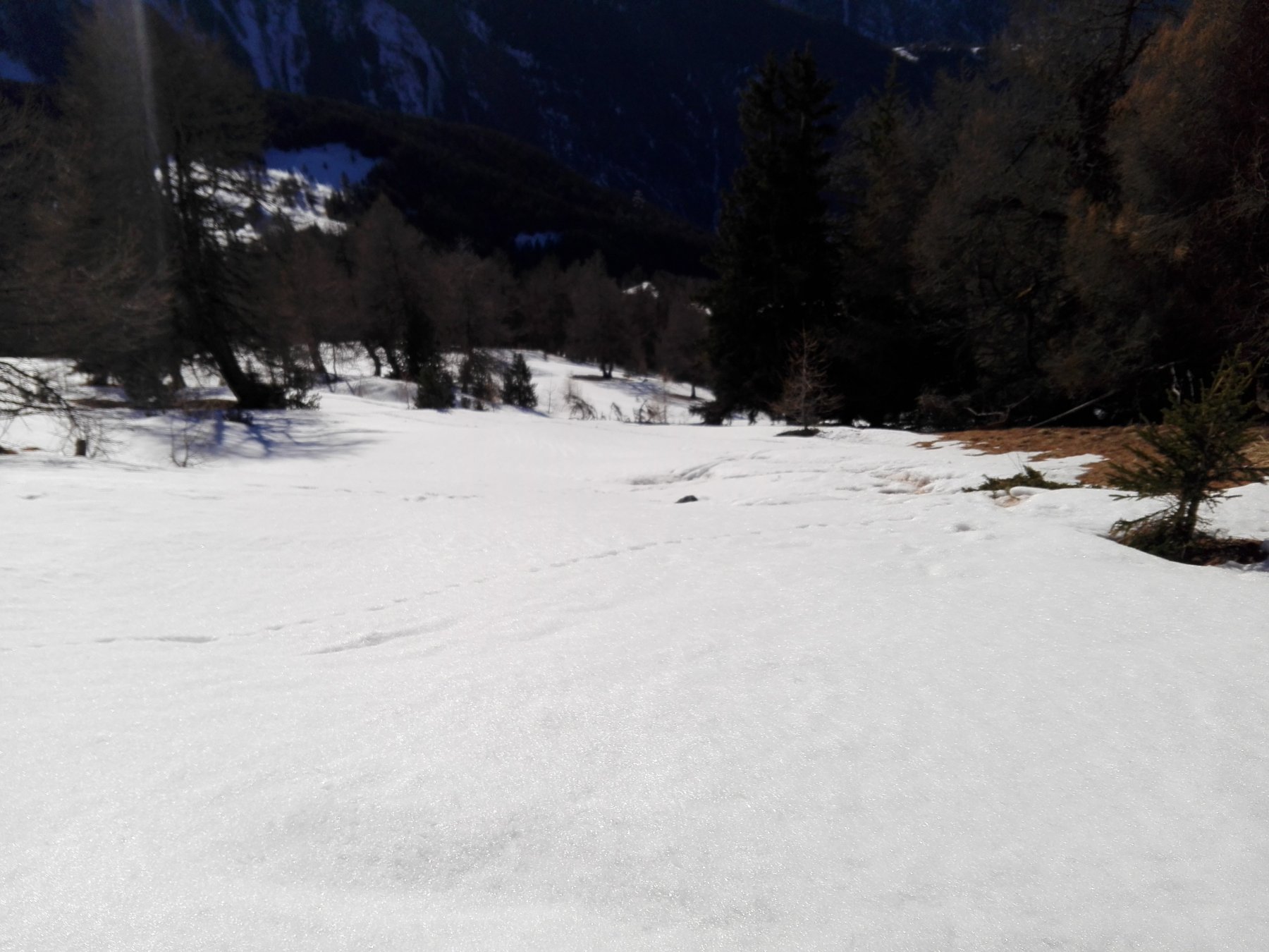Sono partito nel pomeriggio sci ai piedi da casa a Ozein puntando direttamente gli alpeggi di La Rui e salendo oltre la linea del bosco. Sin qua la neve è pochissima, bagnata e sfondosa. Oltre non sono salito perché c’era crosta e poi lo zoccolo anche oggi mi faceva impazzire. Parte bassa con grandi tratti scoperti.