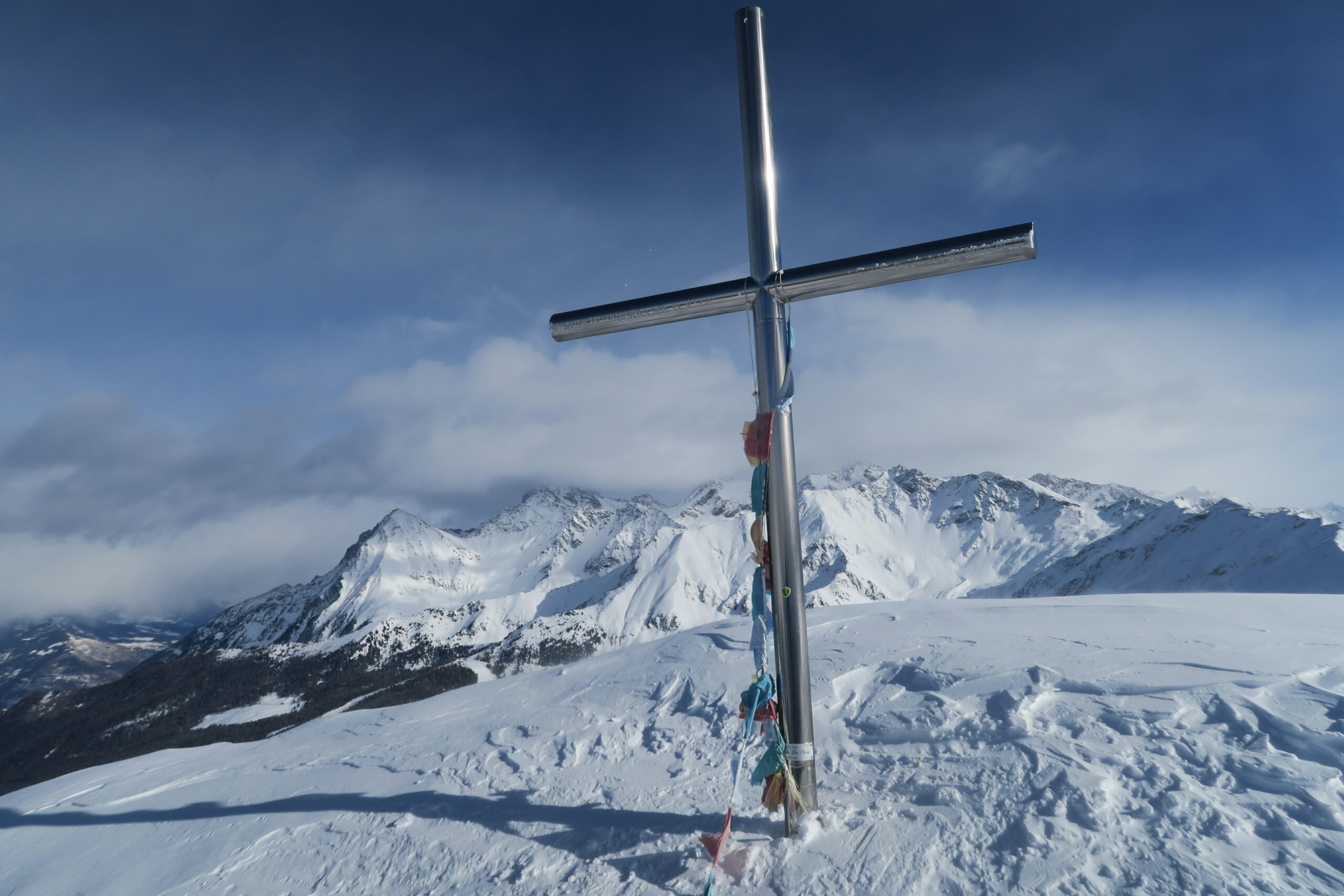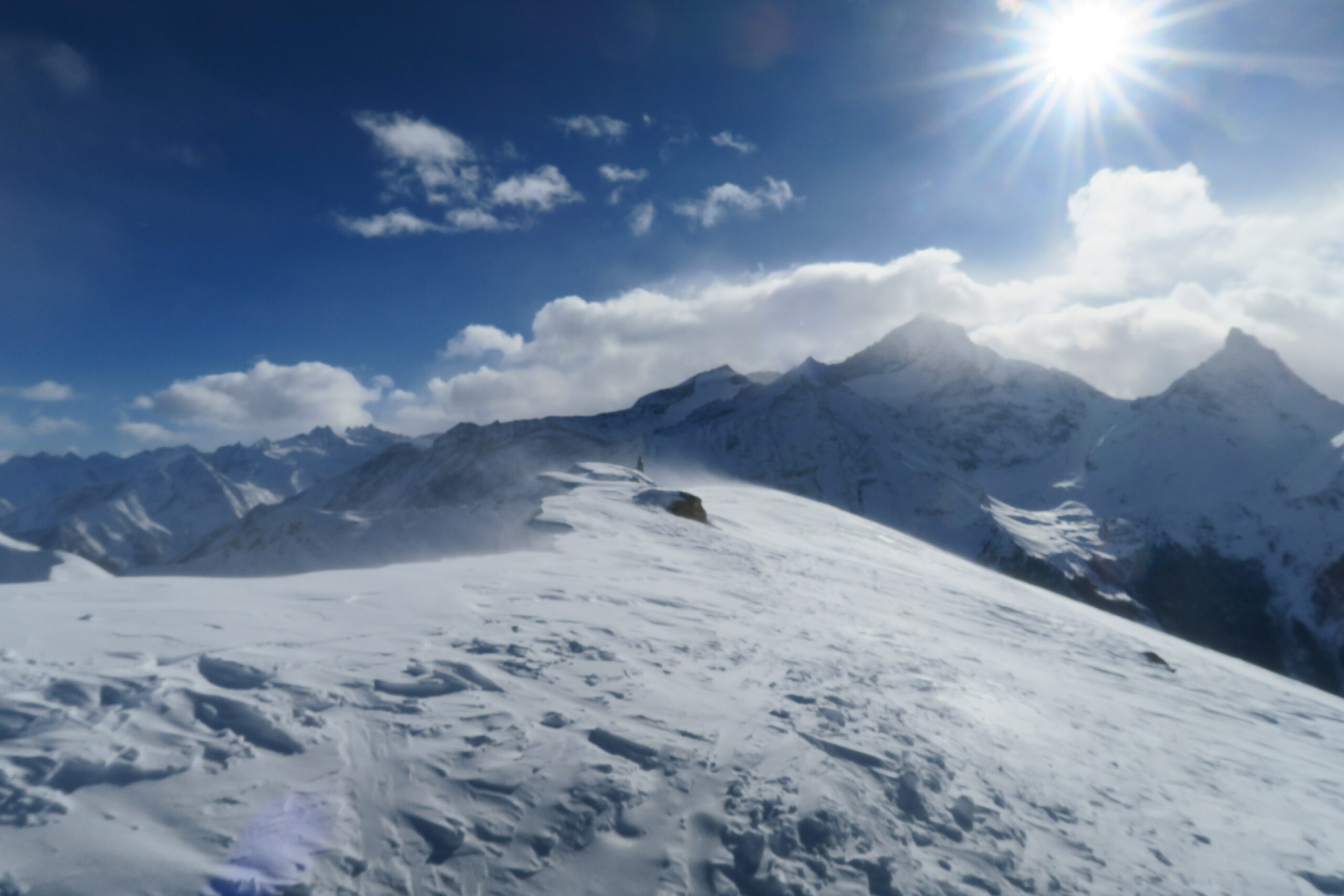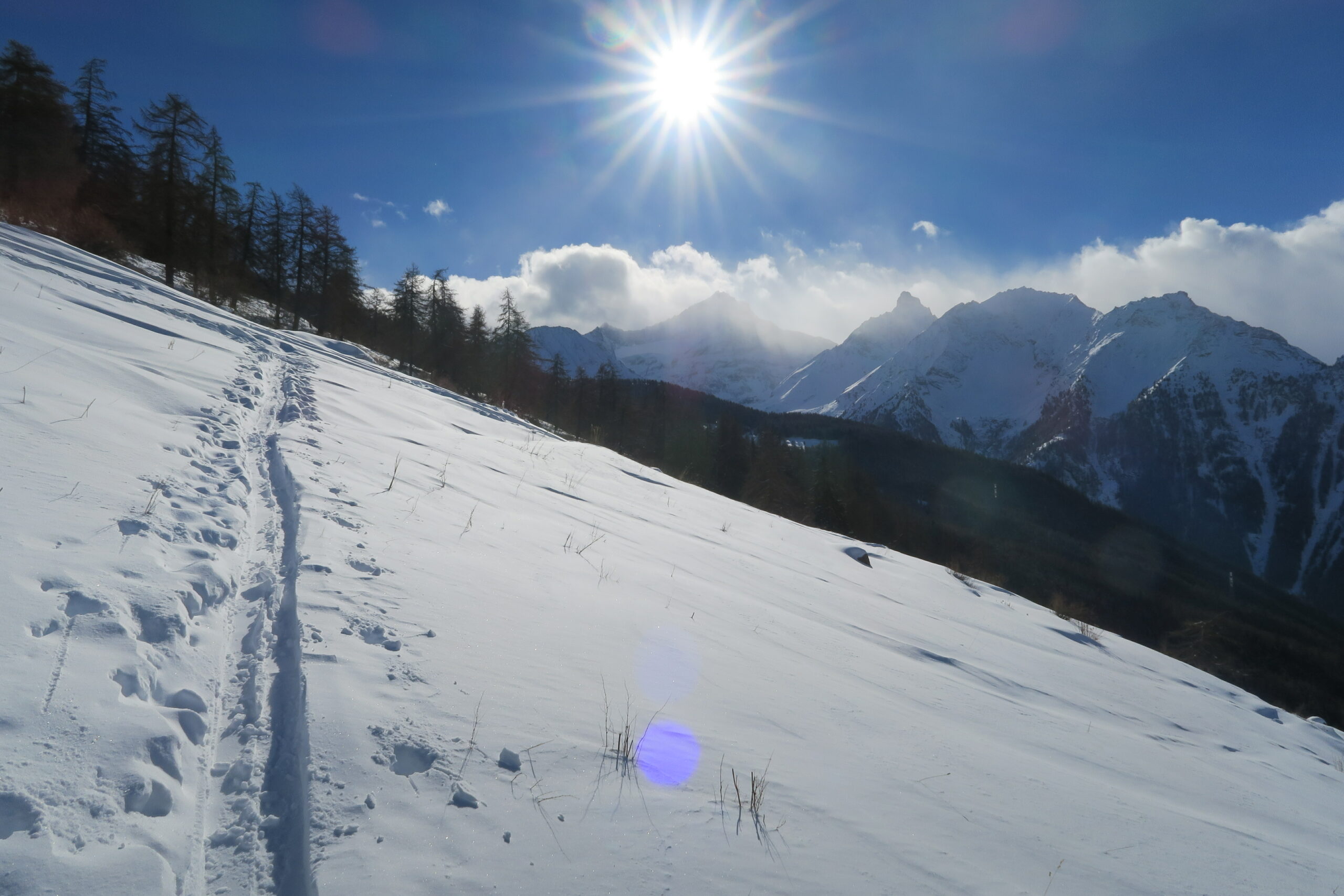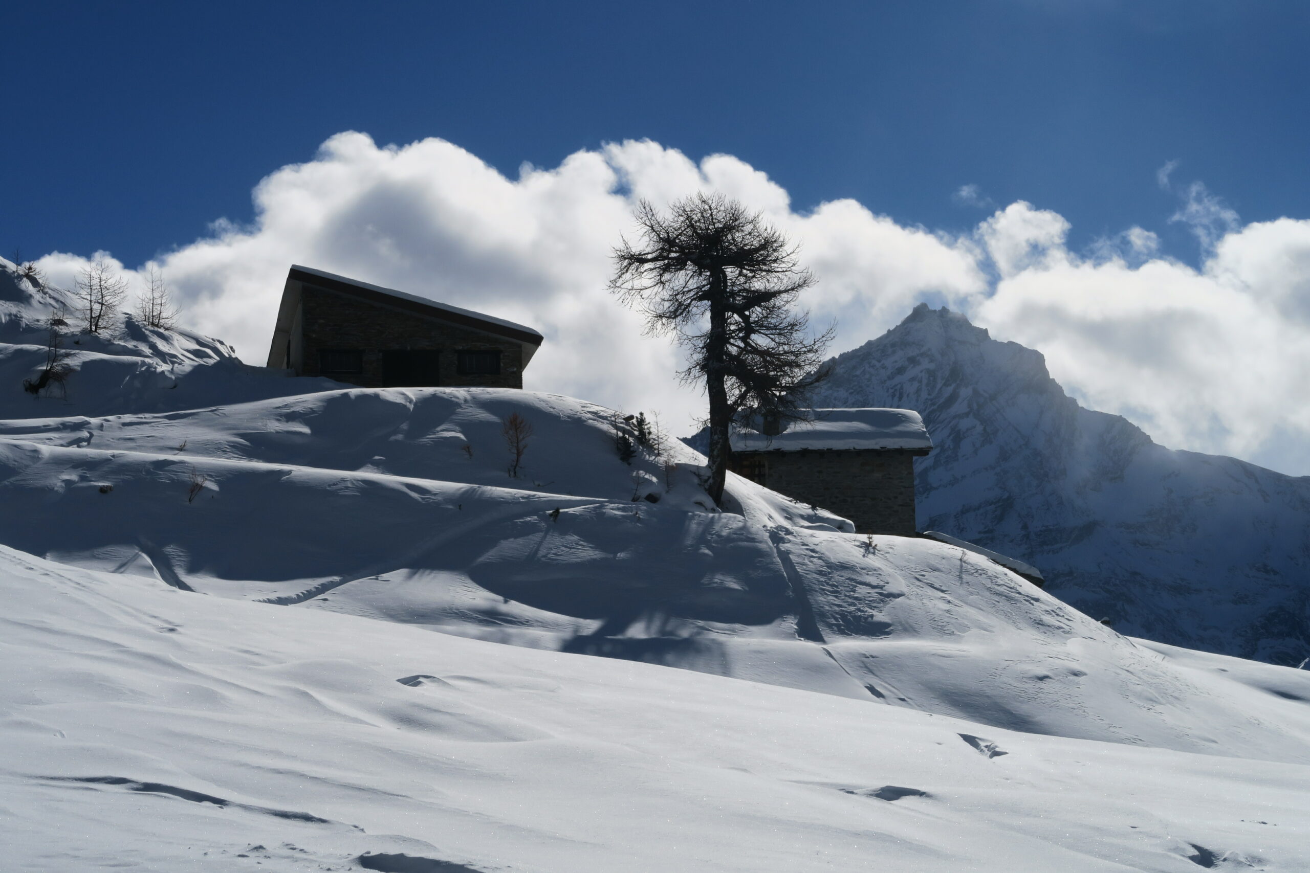 in alto neve assai ventata, molto meglio sotto l’alpeggio.