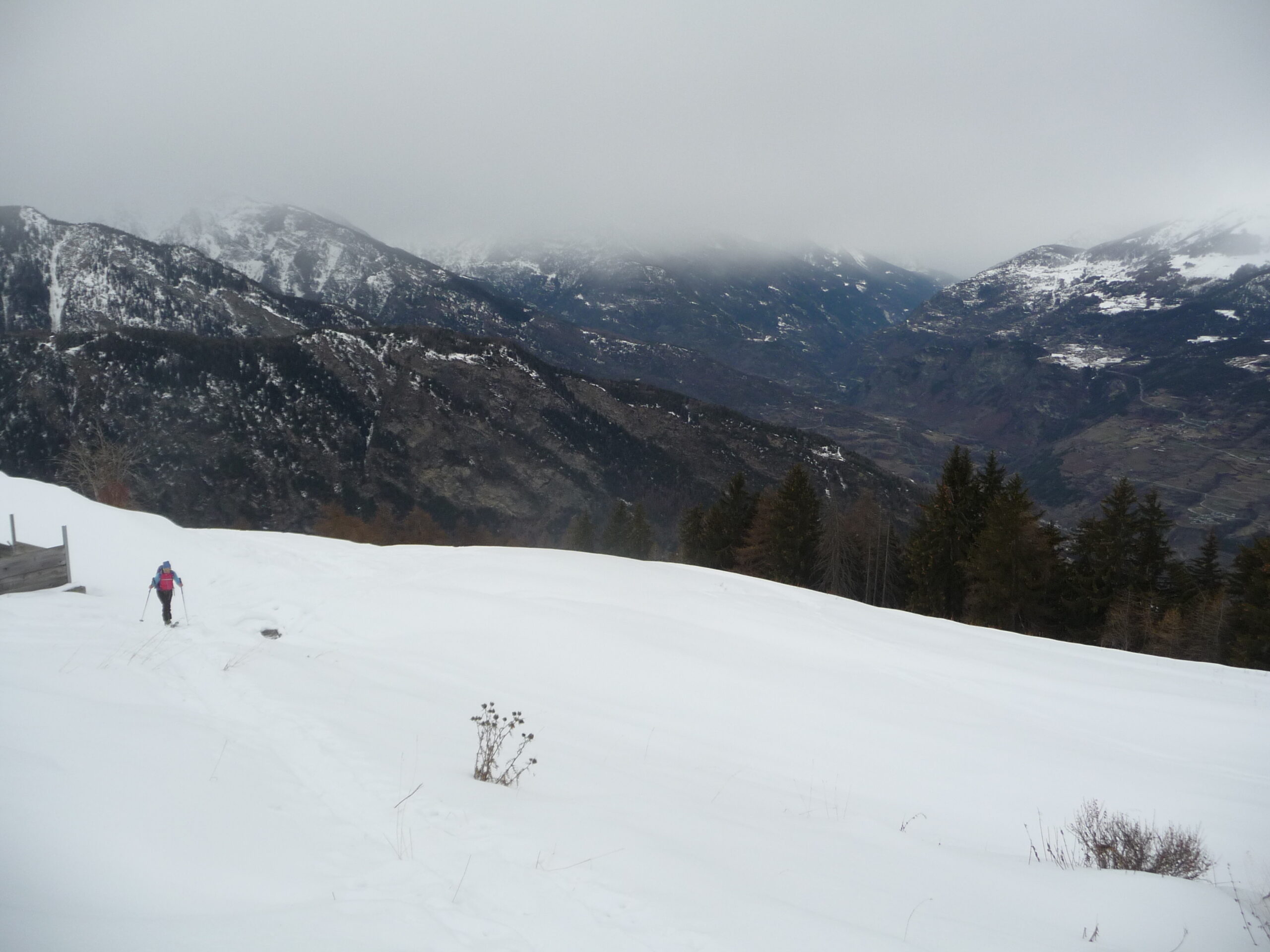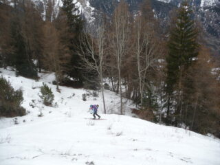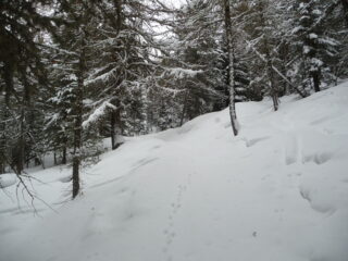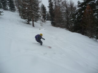 Partiti tra insperate schiarite che durano poco e inizia a nevicare. Saliti per primi e fatto traccia fino al limitare del bosco poi vista la visibilità abbiamo preferito fare un ripello nel bosco. Neve decente in alto orribile nella parte centrale. Rimesse le pelli sempre sotto la neve risaliamo un pò sopra del primo giro con la simpatica compagnia dello zoccolo. Seconda discesa in alto discreta, parte centrale come al primo giro e in basso seguita la stradina compatta.