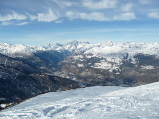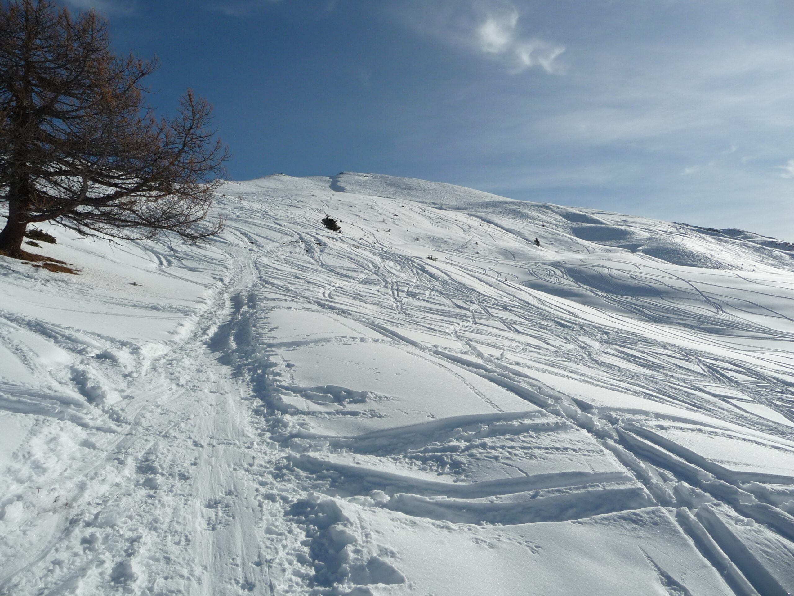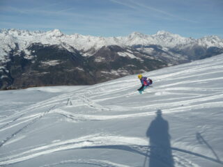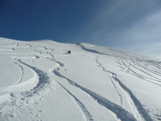 Si parte su stradina ben innevata ma in salita si possono fare dei tagli mentre in discesa conviene seguirla per lo scarso innevamento nei prati iniziali. Parte alta molto tracciata ma con ancora tratti vergini e con bella farina che vale il doppio giro…