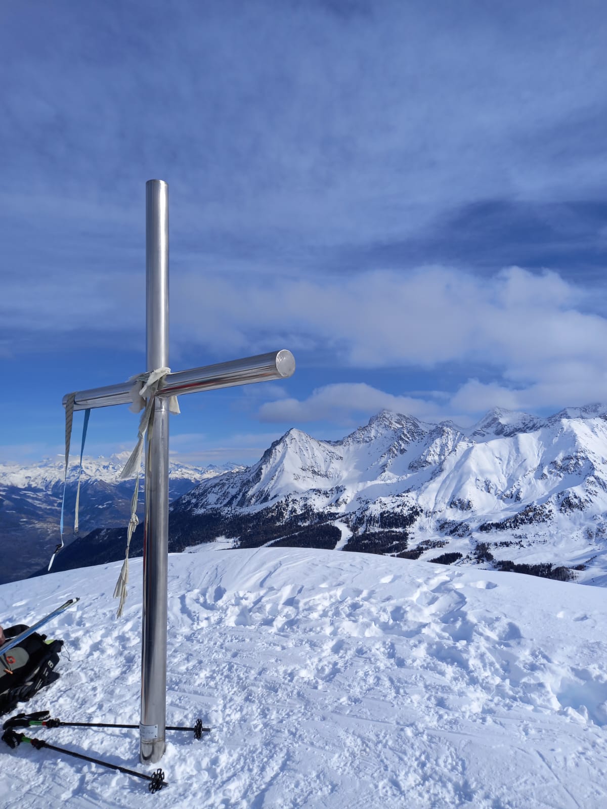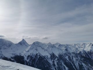 Per ora la gita più bella della stagione, neve continua fin dal parcheggio. Discesa del pendio sotto la vetta già bello tritato. Bella vista sul Bianco e in lontananza il Cervino. Con Piero e Miki