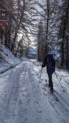 La stradina, che in salita allunga parecchio, in discesa ci ha salvate in quanto scendere nel bosco avrebbe voluto dire fare fuori gli sci.