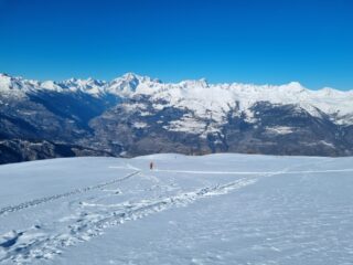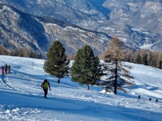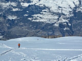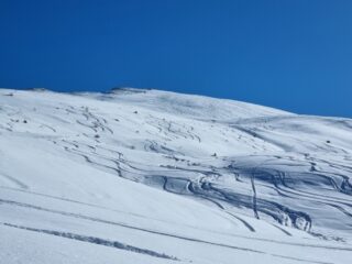 La gita si divide in due parti ben distinte: sotto i 1850 m e sopra i 1850m. Stradina ottimamente coperta fin dalla partenza, battuta dai tanti passaggi in salita e discesa. Fuori non si esce: poca neve e crostaccia infame. Arrivati ai prati superiori, i primi 50 m di dislivello (fino ai 1850, appunto) ancora crostaccia con le bugne a indicare che ci ha piovuto sopra, poi, nell’arco di pochi metri… farina bellissima, che rimane tale sia nel bosco intermedio, che su tutto il platau. Solo la spalla sommitale è spelacchiata dal vento, ma, tenendosi un po’ a sinistra, si entra subito nella farina.