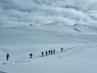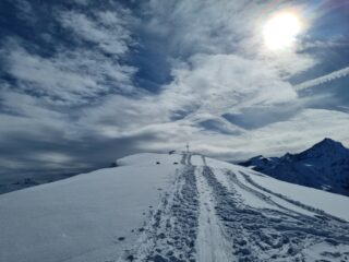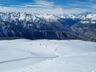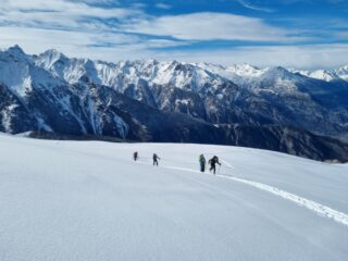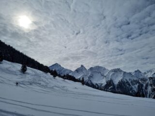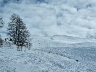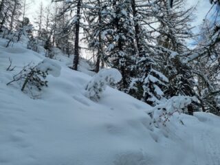 Un po’ di sconforto in partenza e poi su tutta la stradina: sotto i 1800 m non ha fatto quasi nulla. Per fortuna, la stradina ghiacciata tiene ancora abbastanza, sebbene presenti numerose interruzioni di pochi metri. Finita la strada, però, la situazione cambia in fretta e si trovano dai 20 ai 30 cm di neve fresca polverosa su buon fondo.