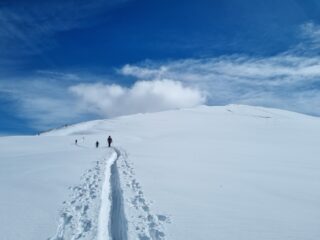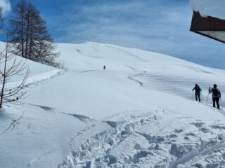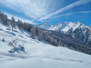 Nel bosco intermedio, visto che la neve era spaziale, non mi sono riallacciato ai prati intermedi, ma ho continuato sul ripido versante nord, tra i pini, fino a incrociare la strada che va verso Pila. Neve straordinaria, serve solo una buona padronanza degli sci, perché il bosco è fitto e la pendenza sostenuta. Il rientro verso ovest sulla strada pianeggiante richiede 15-20 minuti.