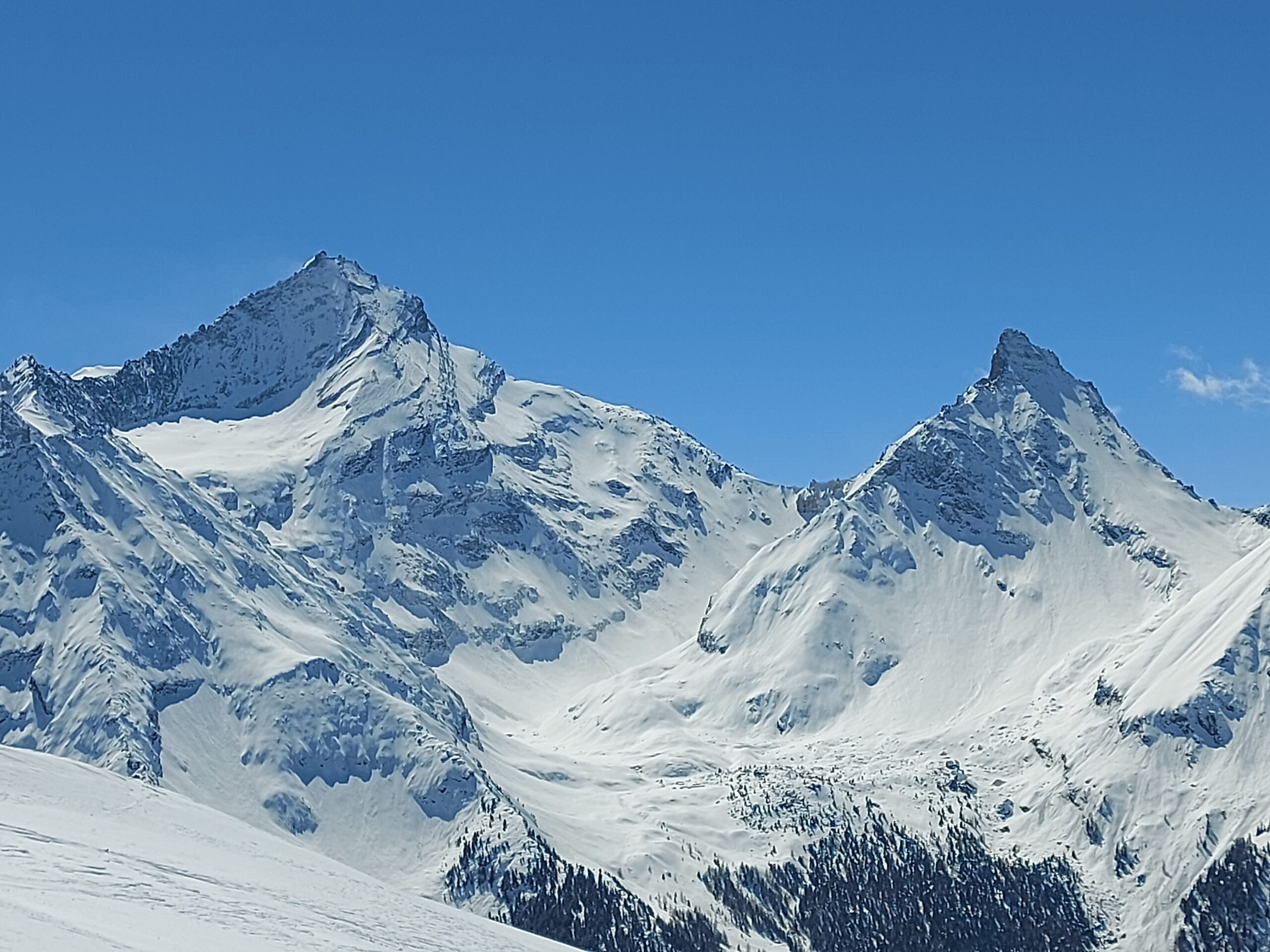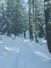 30 minuti con sci in spalla, poi inizia la neve continua. Discesa su neve polverosa un pò pesante ma divertente fino alle baite, poi nel bosco conviene seguire la strada fino ai pendii sciabili che portano alla strada che arriva all’auto.