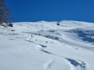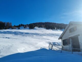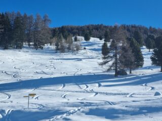 Discesa. Incredibilmente, si scia bene anche sotto la punta: i lastroni piatti di neve ventata coperti dalla polvere si distinguono bene dalle zone gibbose coperte da poca neve fresca. Poi, goduria assoluta per tutto il platau, ancora di più sui prati intermedi. Nel bosco che taglia i tornanti della stradina la neve è un po’ pesante, ma ancora ben sciabile. Solo una leggera grattatina, senza danni.