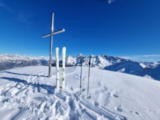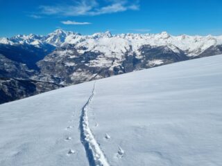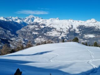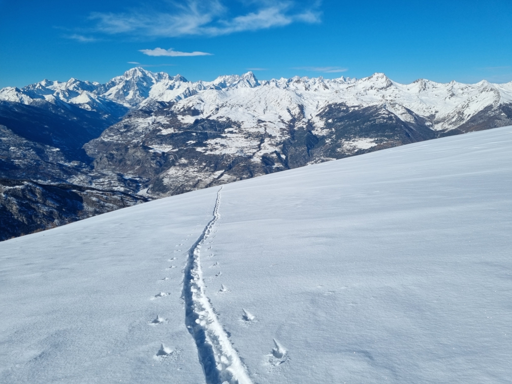 Oggi mi aspettavo una gita al limite della sciabilità, e invece ne è uscita forse la miglior Pointe de la Pierre di sempre (e ne ho fatte davvero tante!). Innevamento molto buono già dalla partenza, con la stradina stra-coperta, ma la si segue per poco, perché si può subito tagliare nel bosco e in breve si arriva ai prati superiori. La neve vecchia di una settimana si è già assestata e risulta portante e ben coprente. Sopra, una spanna di farina caduta l’altra notte. Ottima copertura anche nel breve e ripido bosco alto, prima del platau. Platau spettacolare, anche perché quasi ancora tutto vergine. Spelacchiati solo gli ultimi 50 m di dislivello sotto la punta.