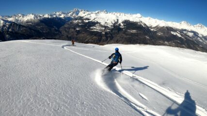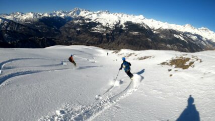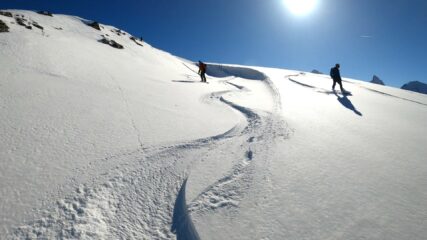 Tutto super tritato! Salendo non avremmo scommesso 1 euro su una bella sciata. Invece siamo riusciti a trovare ancora pendii intonsi: 5 stelle fino a champchenille poi solo fazzoletti al limitare del bosco, dai 1600 seguita la strada ben innevata. Pochissima gente in giro oggi!