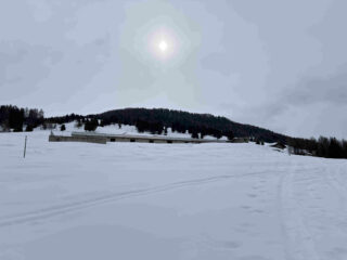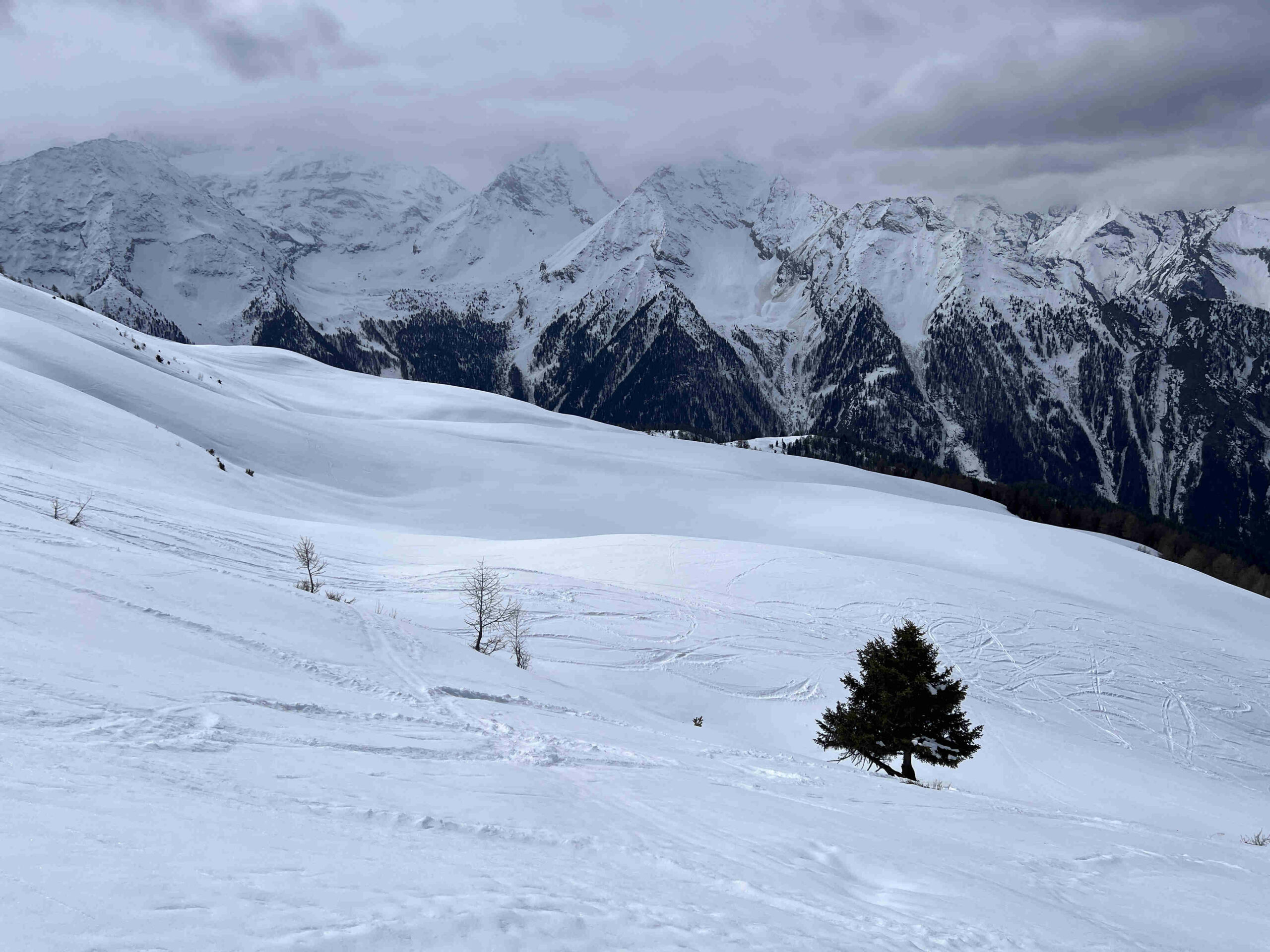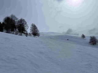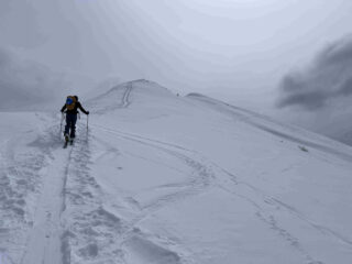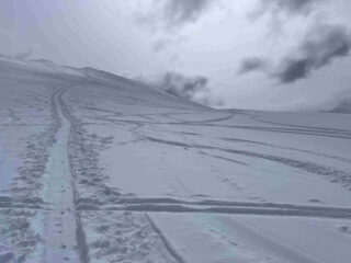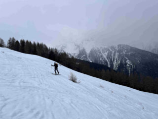 La stradina di salita richiede molti gava e buta per i primi 200 metri di dislivello. Dai 1700 metri in su neve continua. Giornata grigia con un po’ di nevischio che però è migliorata verso mezzogiorno permettendoci una discesa con vista su gruppo della Grivola e del Monte Bianco. Prima parte primaverile trasformata poi un tratto con leggera crosticina da sciare delicati ed infine nuovamente primaverile verso l’Alpe Champchenille. Tratto nel bosco duretto e sfondoso per cui abbiamo preferito seguire la stradina fino a sopra l’alpeggio di Romperein. Ancora qualche bella curva sotto l’alpeggio e poi siamo stati a destra su consiglio di un local incontrato in cima in modo da seguire il sentiero n. 1 ed arrivare con gli sci ai piedi ai Chalet Turlin. Da lì sono ritornato a piedi a recuperare l’auto in circa 10 minuti per poi venire a riprendere il mio socio.