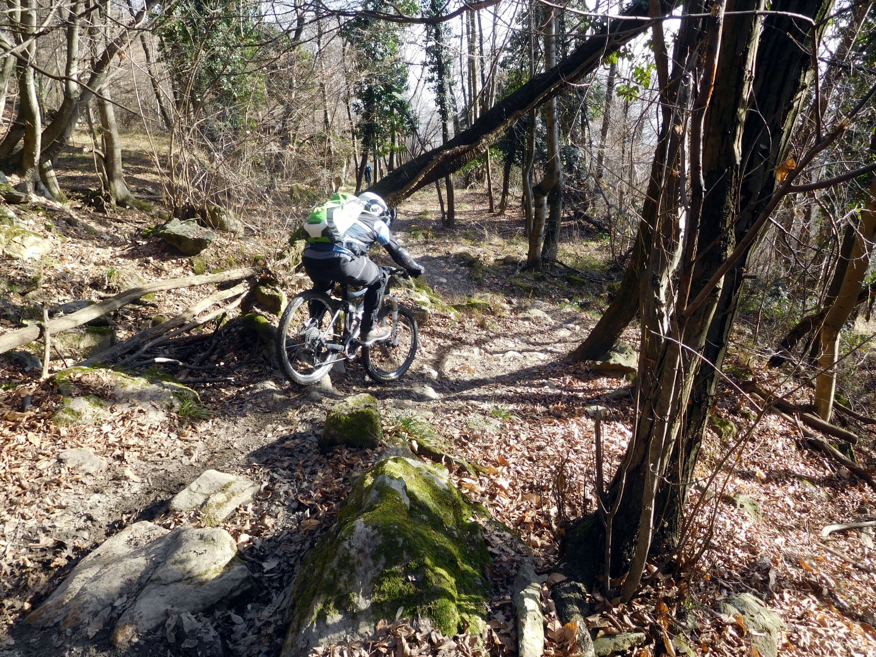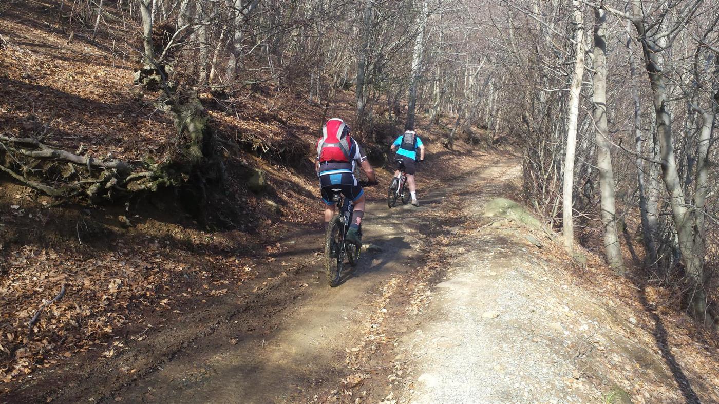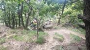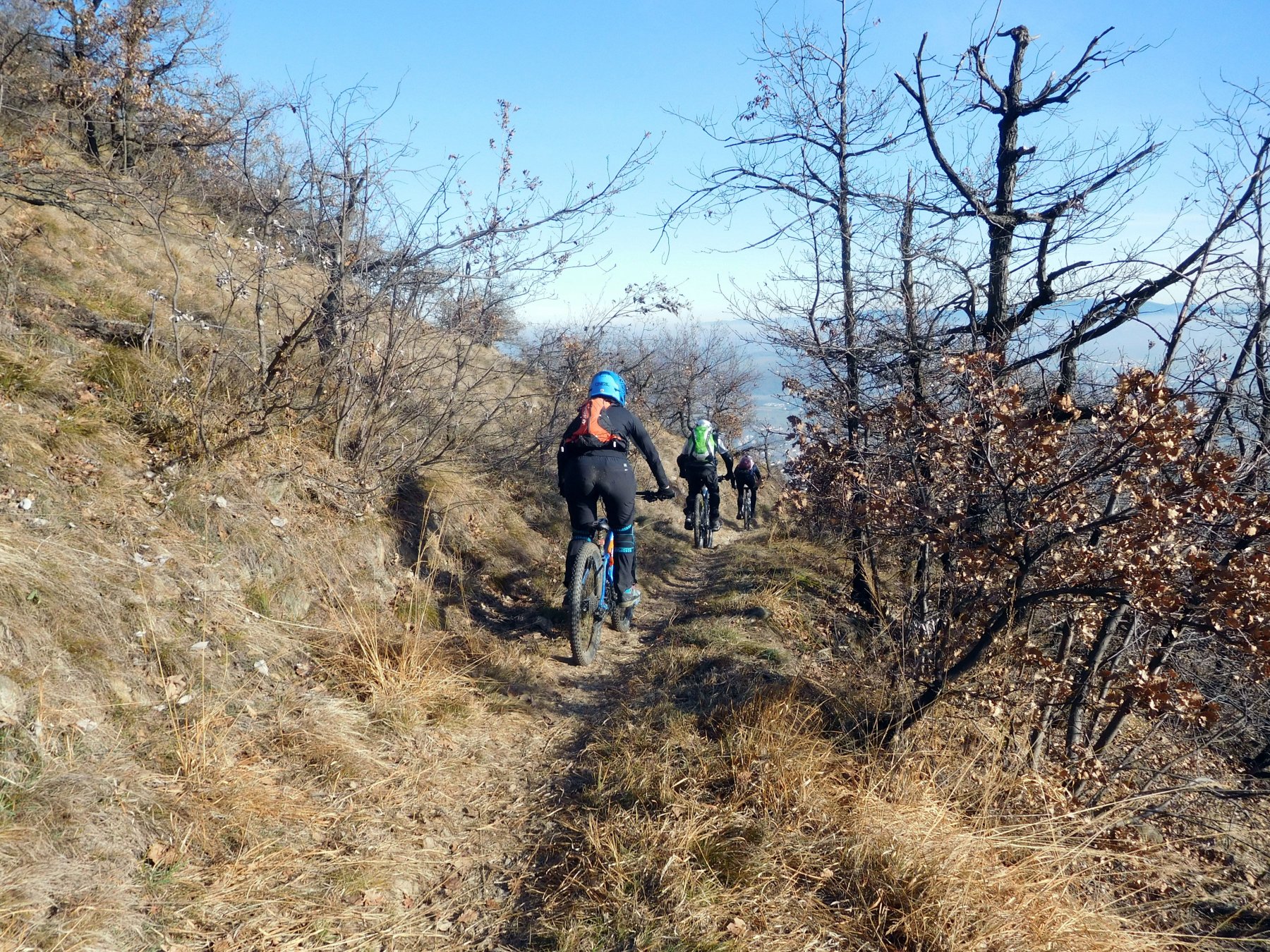 Poco prima del cartello parte il sentiero dei Cinghiali che si sviluppa per circa 2,5 km su fondo prevalentemente terroso. La prima parte è più scorrevole con solo qualche radice, poi diventa più impegnativo per tratti scavati dall’acqua, saltini su roccia e pendenze più sostenute. Quelli bravi la fanno interamente in sella. Solo brevi passaggi di S2 e uno di S3. Si prosegue poi con pendenze più dolci attraversando il bosco delle fate. Tratto in piano molto scavato dall’acqua e poi facile e scorrevole fino al termine a Sangano dove ci si immette sull’asfalto di Via delle Prese. Si svolta a sx , alla rotonda si imbocca la Via Merlino che diventa poi strada bianca si passa Regione Galli, Villaggio la Quercia e infine Piossasco.