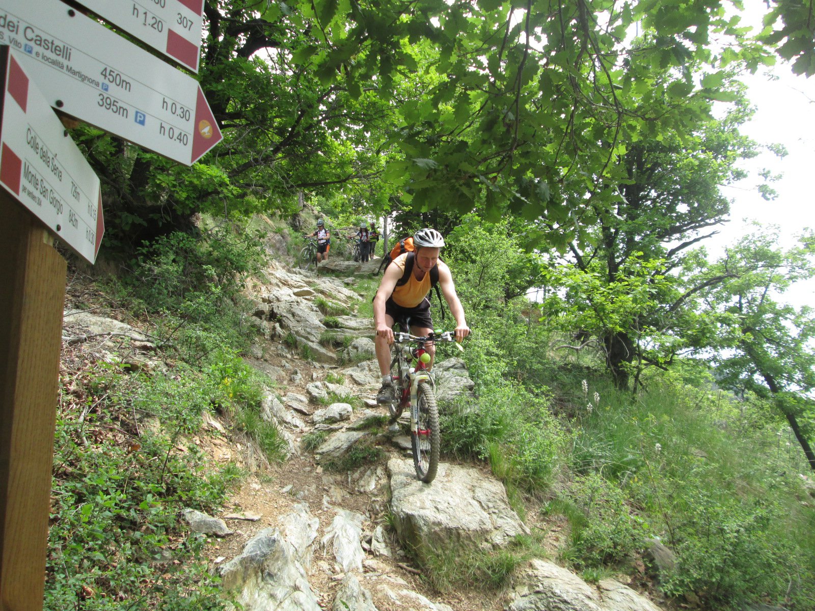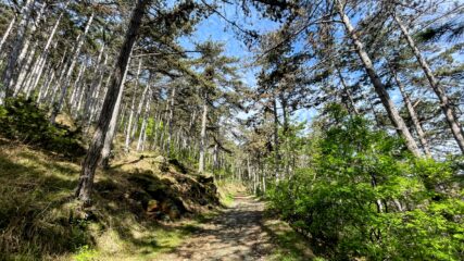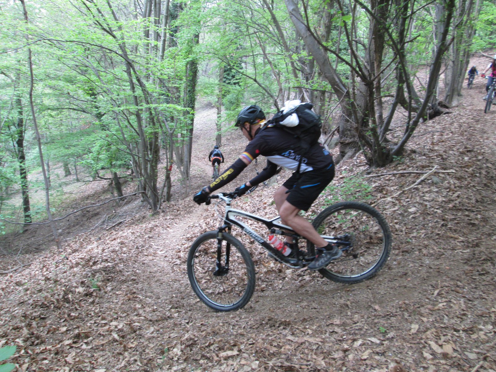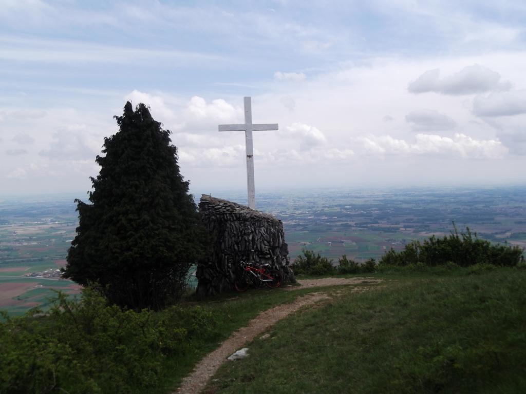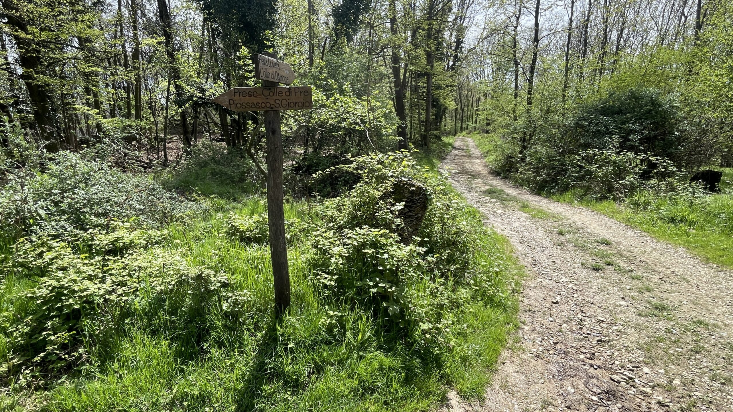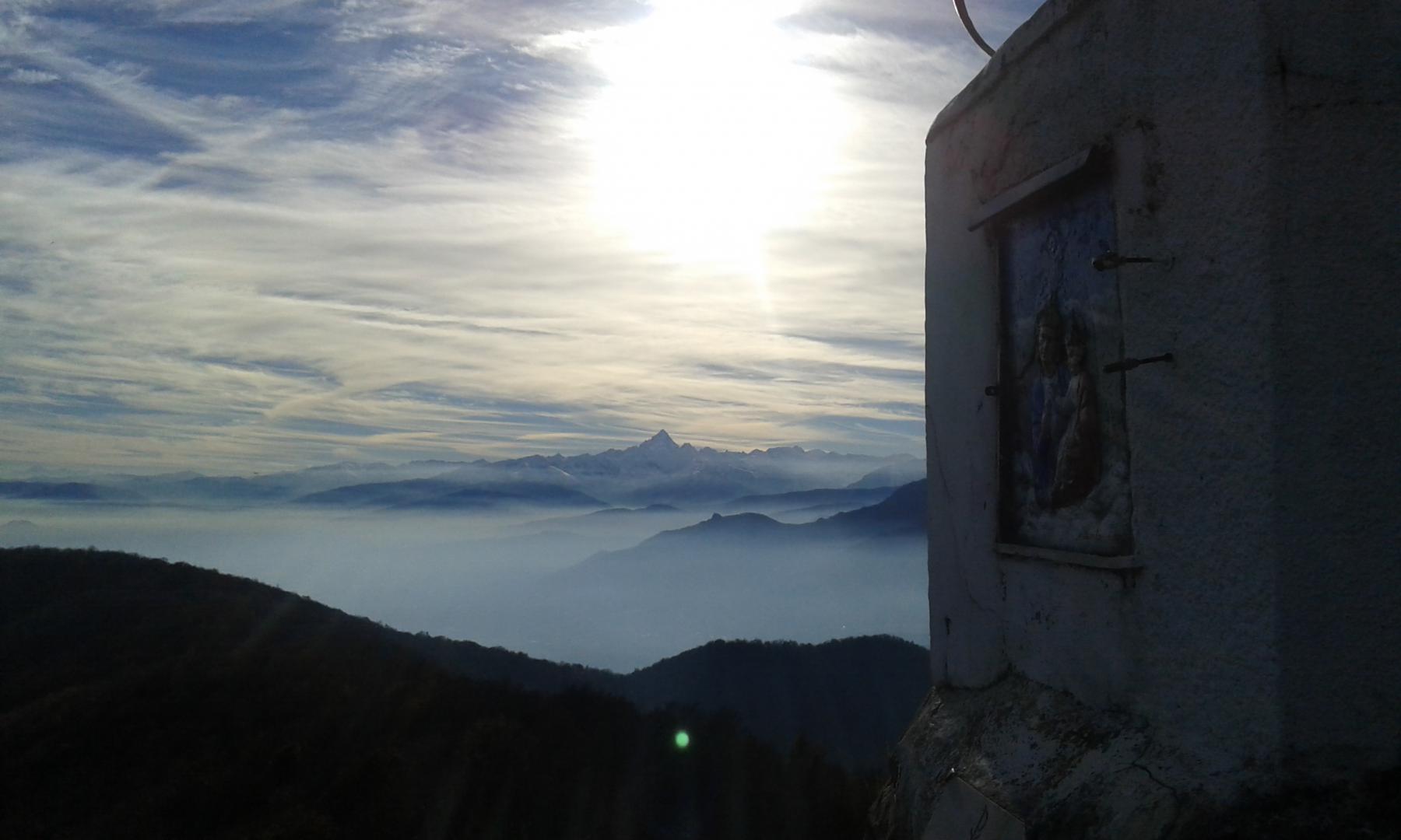 Lasciamo le bici e con pochi passi raggiungiamo la croce di vetta. Uno sguardo al panorama molto esteso e via a ritroso al bivio raggiunto prima, seguiamo ora sempre lo stradello che abbiamo lasciato prima e sempre in salita arriviamo a dei ripetitori televisivi, subito dopo, scendiamo verso sinistra nord ovest fino alla borgata Prese di Sangano, proseguiamo verso destra est fino alle Prese di Piossasco Superiori, metri 730 circa, proseguiamo ora per la Cappella Madonna della Neve, in stato di abbandono in mezzo ai boschi, proseguiamo ancora oltre fino ad arrivare al Colle di Prè metri 730 circa e km 12.