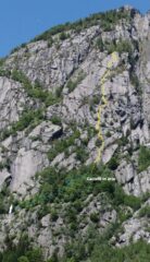 Parzialmente attrezzata a spit, da integrare con friends e nuts, questa nuova linea affronta un vasto sistema di placche che si trova sulla porzione destra della struttura, a destra della via Marica.