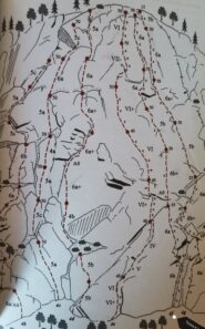- L5: Puntare al primo spit (alto) leggermente a sx, aggirare il tettino a sinistra poi tornare a destra puntando gli spit in placca fino alla sosta in un canalino nero. 6a, 45m, 4 spit