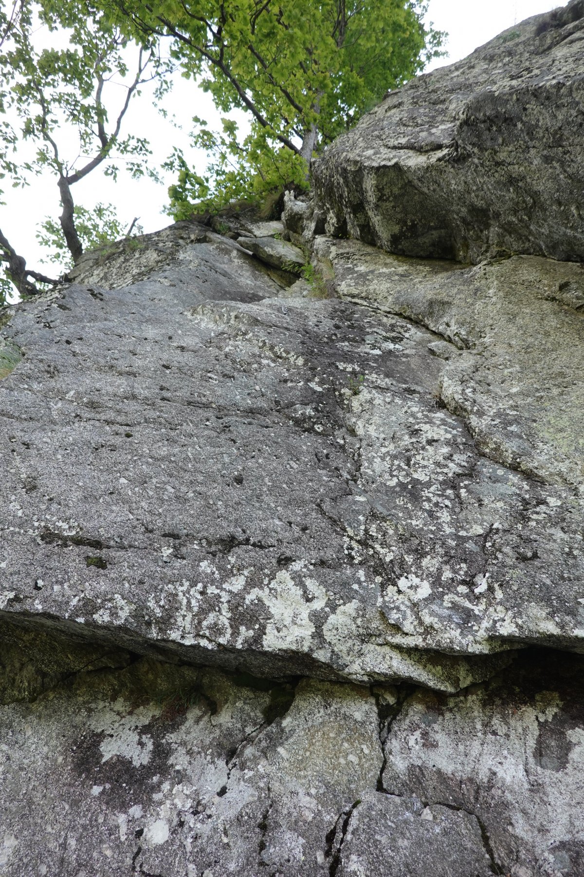 - 5° tiro: Per bel muro a lame per poi uscire su placca verticale a tacche. 6a+; 35m.