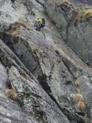 - 3° tiro: Per lame fino ad una radice di una pianta dove ci si sposta a destra e si sale verso sinistra alla sosta appesa a destra di una pianta. 6a; 25m.