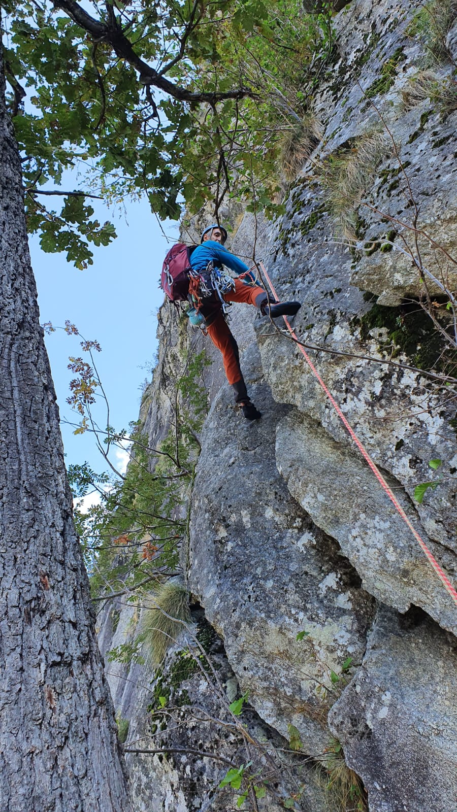 - 1° tiro: Salire per placca in leggero diagonale verso destra fino ad entrare in un diedrino che porta ad una cengia dove sisosta su albero. 6a+; 40m.