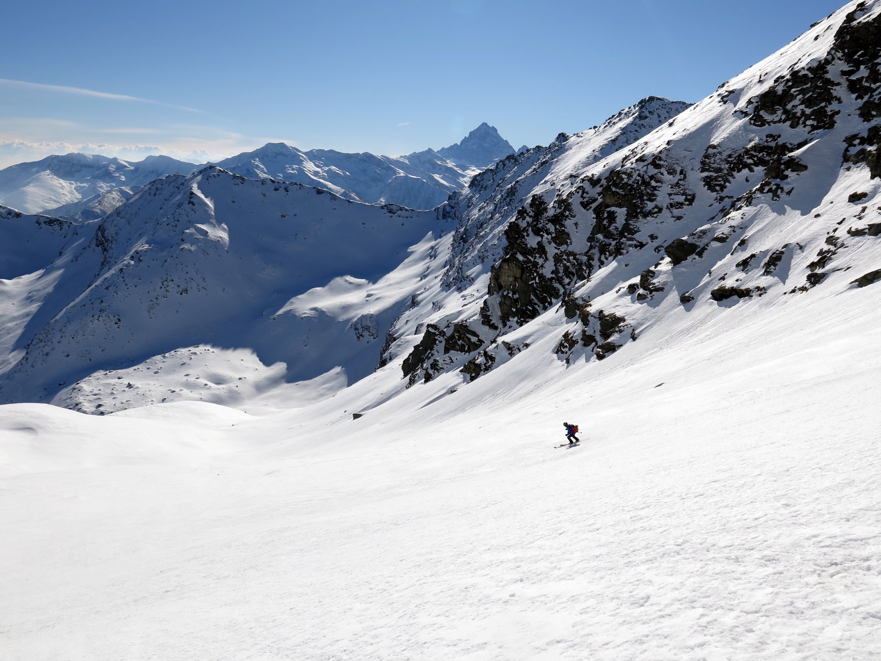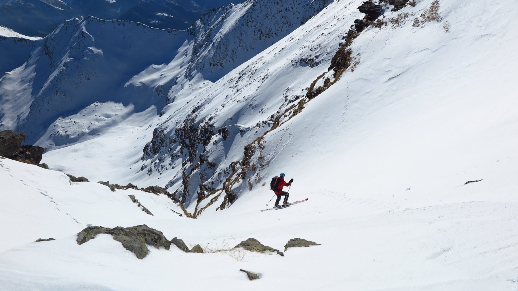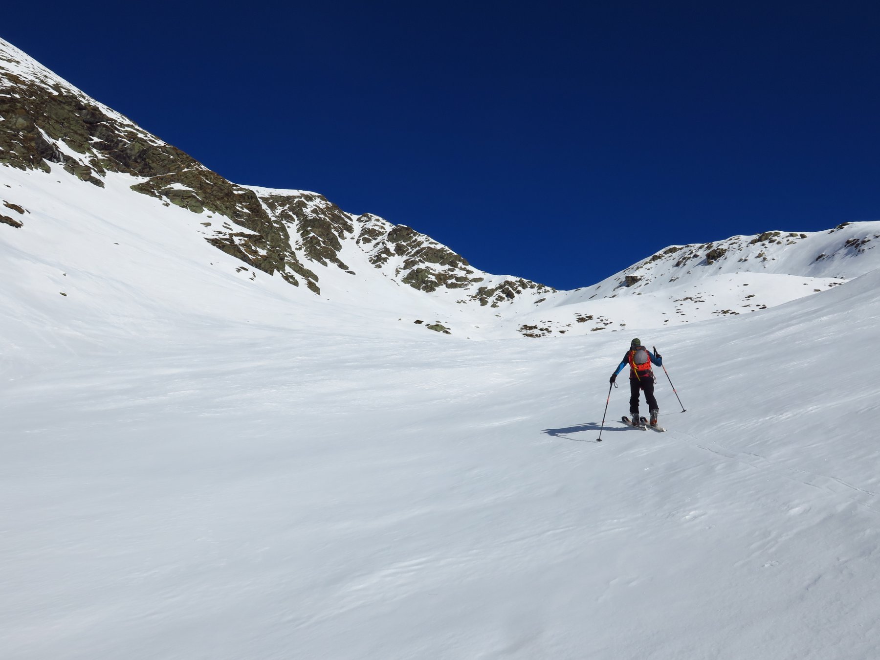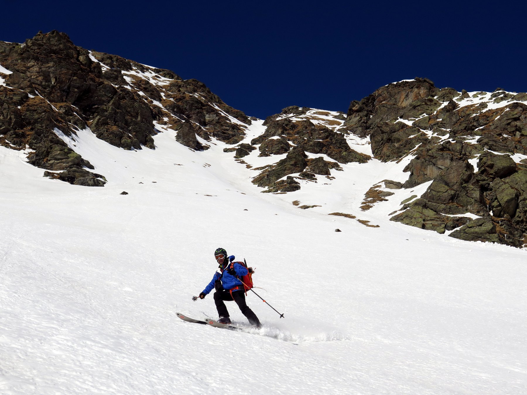 In discesa si segue fedelmente l’itinerario di salita, ovviamente con possibili divagazioni di linee data l’ampiezza dei pendii. Una volta tornati sulla strada c’è ancora una breve risalita (fattibile senza ripellare) poi scorrevole fino alla macchina (ovviamente in presenza di neve).