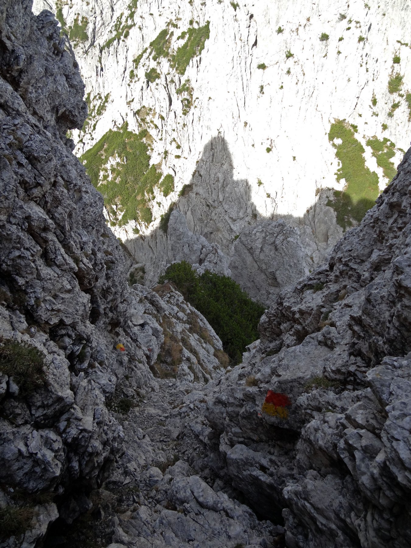 Dalla forcella sono ben visibili su entrambi i lati i segni giallo/rossi del celebre viàz dei Camòrz di Franco Miotto, che in questo punto trova il passaggio tra la seconda e la terza parte.