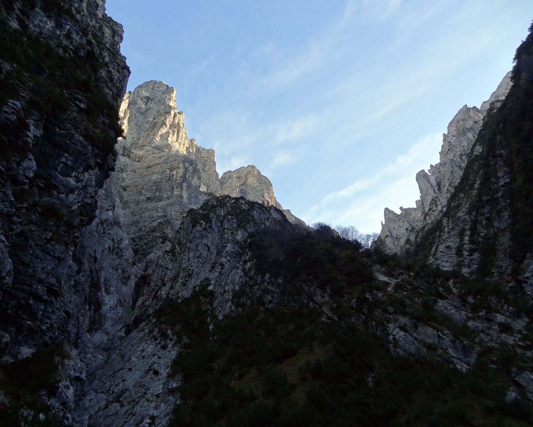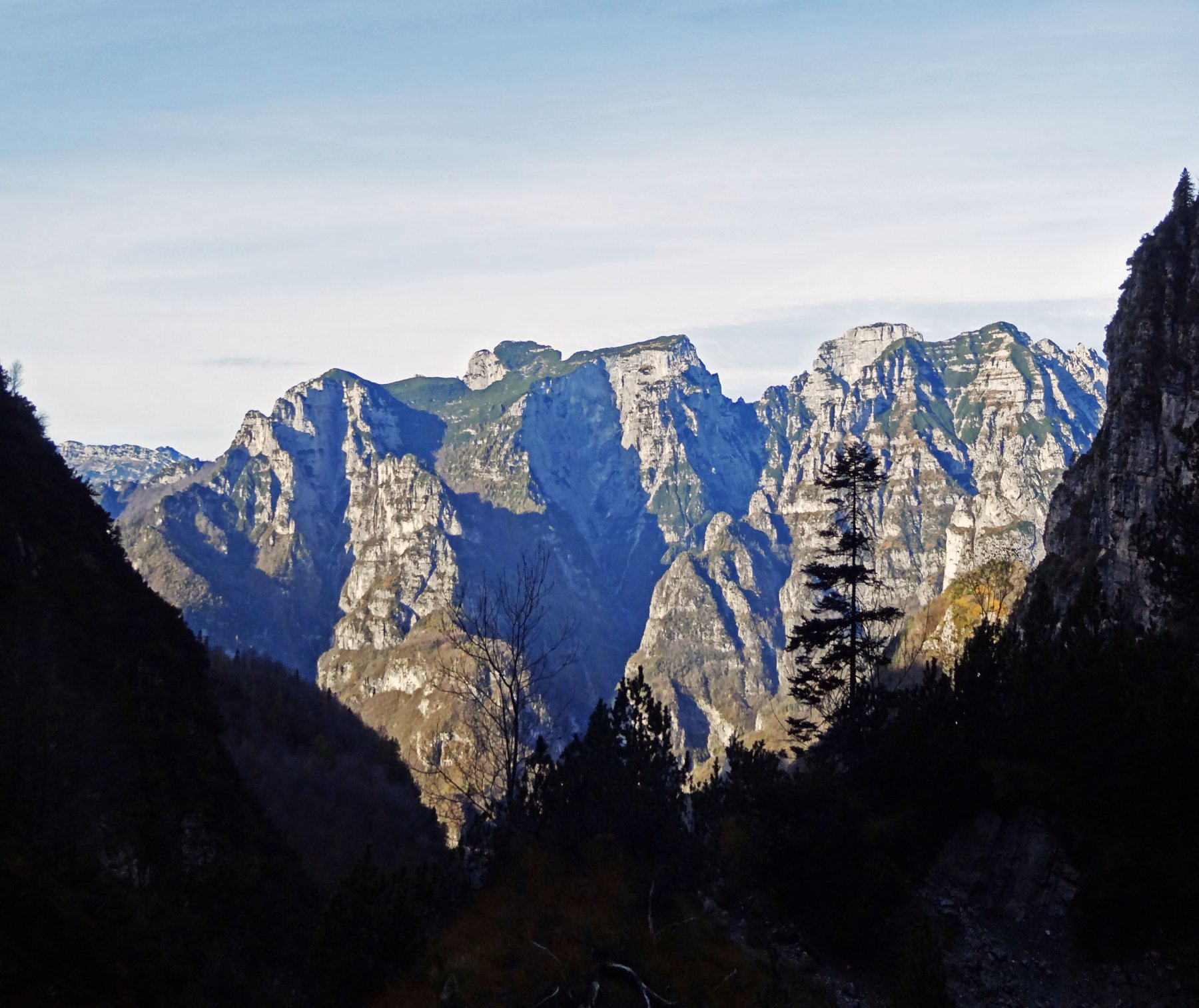 Su entrambi i lati della valle incombono i dirupati versanti della Schiara e dei Monti del Sole.