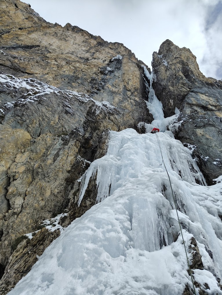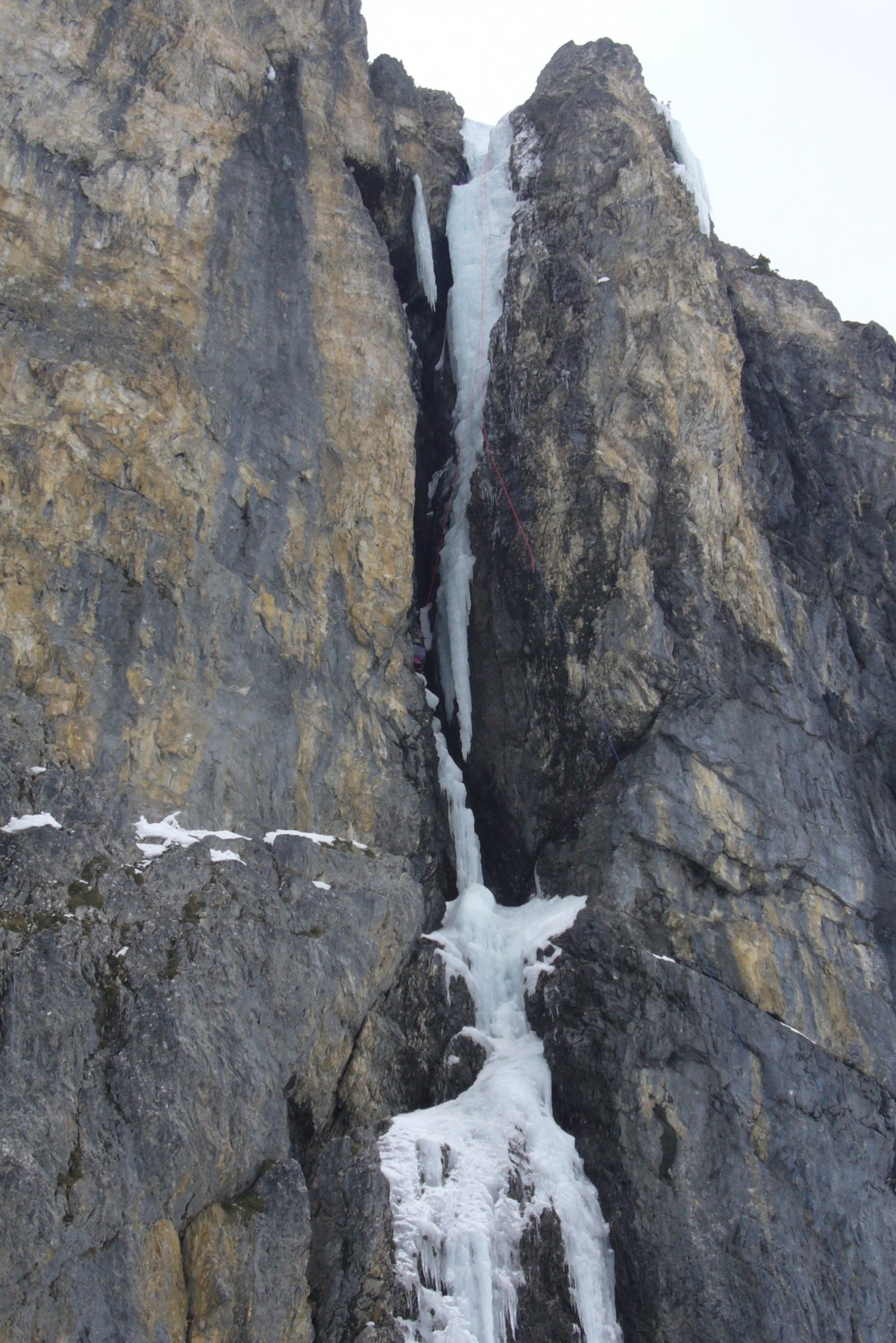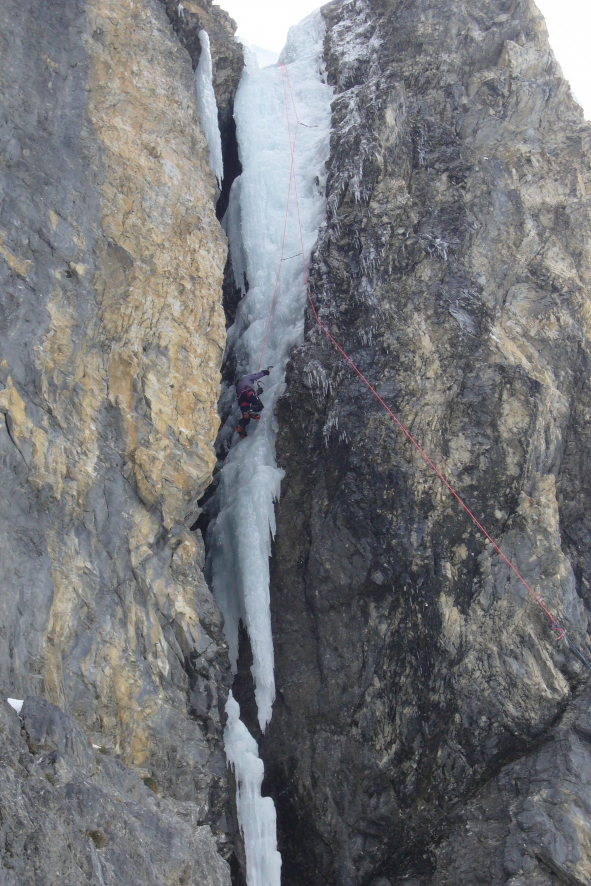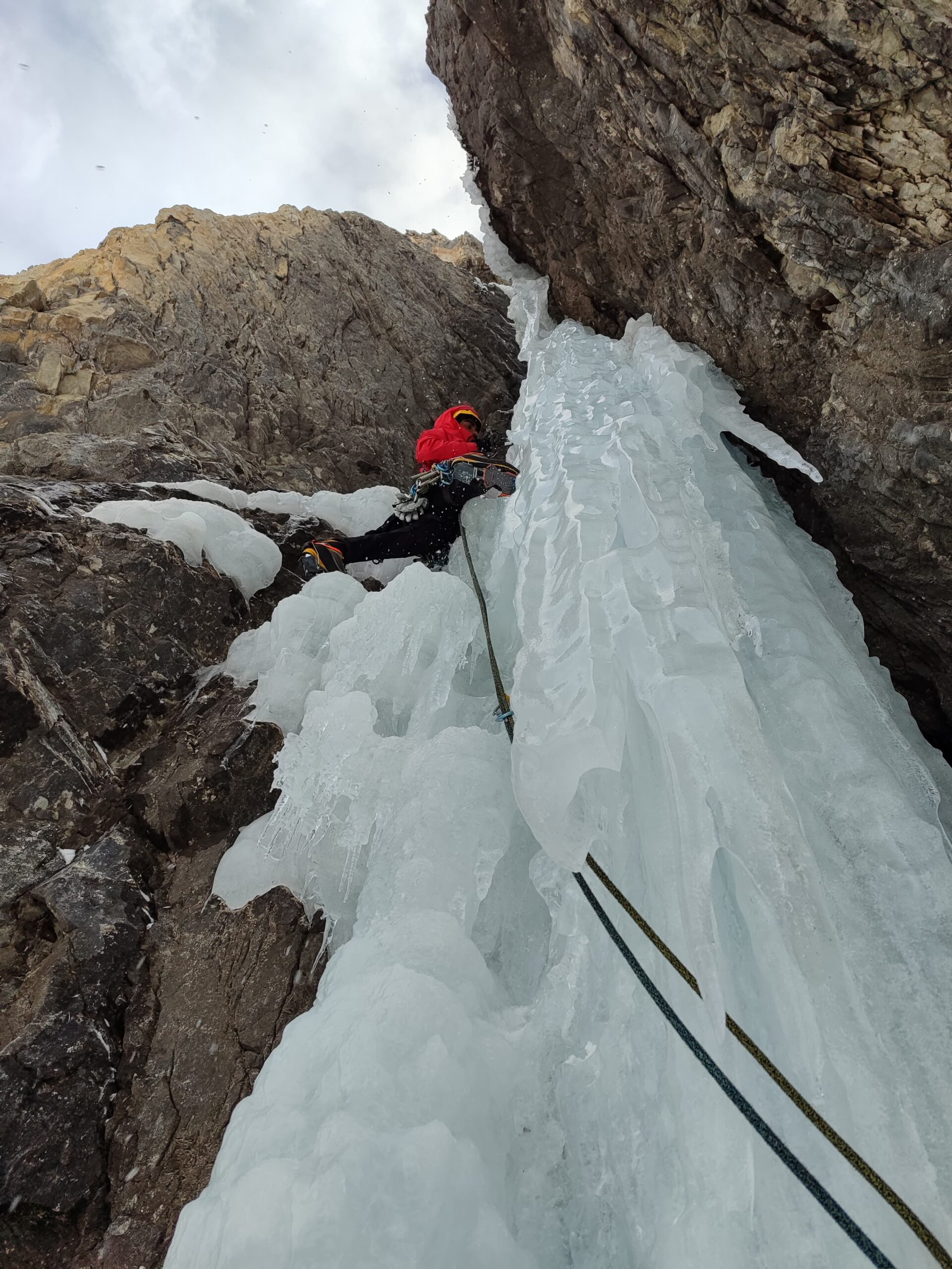 L1, 20 metri, spesso ghiaccio sottile all’inizio. Sosta su “Multimonti” nella nicchia. L2, 60 metri, stalattite (fix di protezione) e poi splendido muro. Calata da Abalakov.