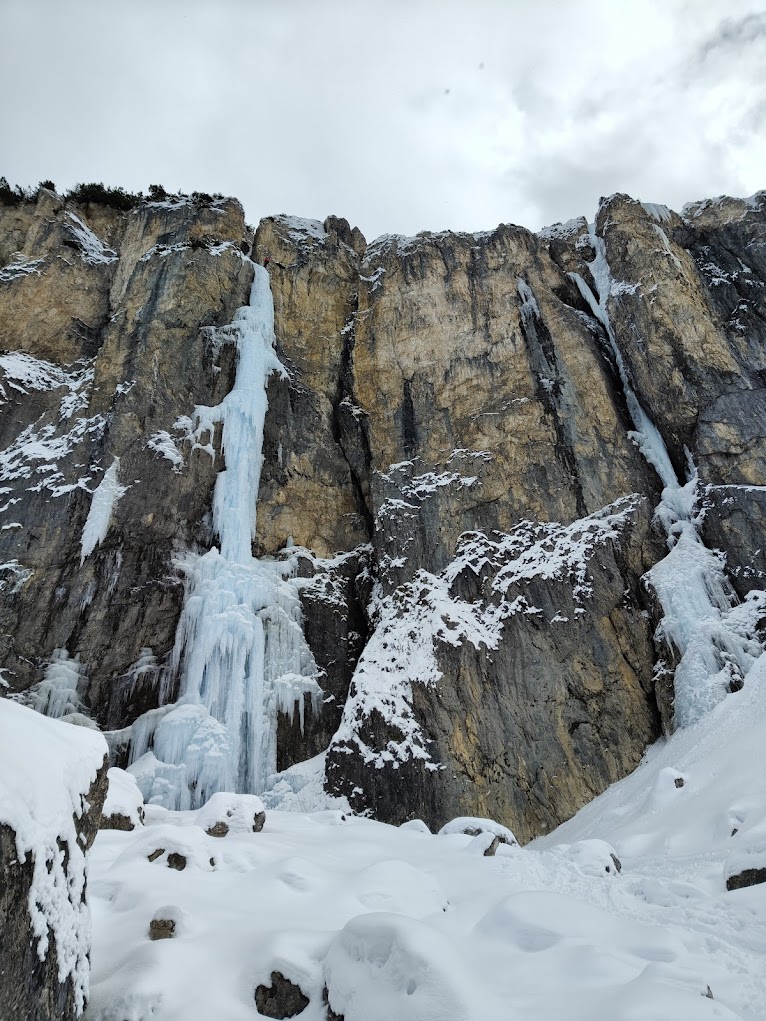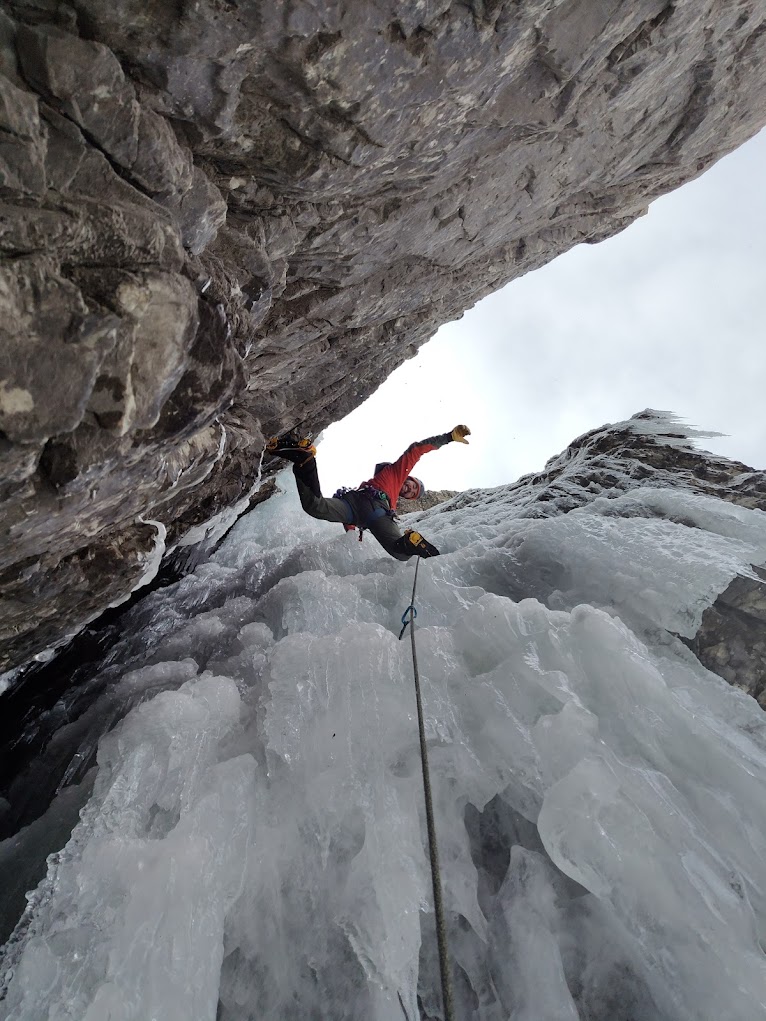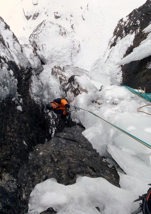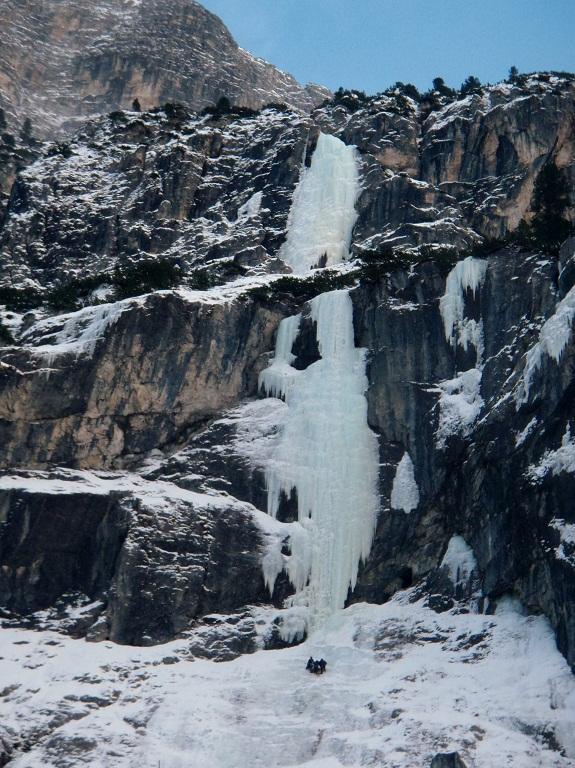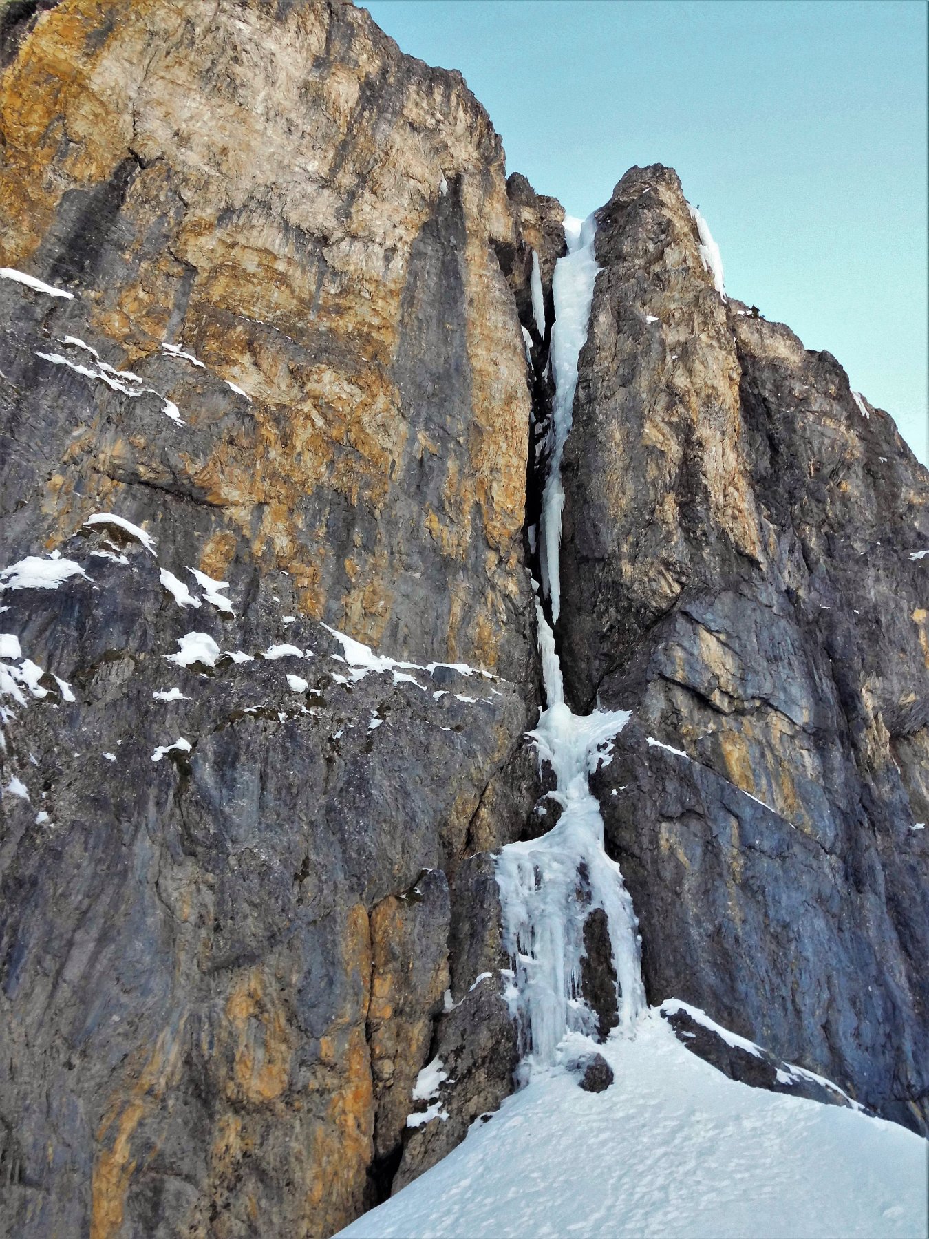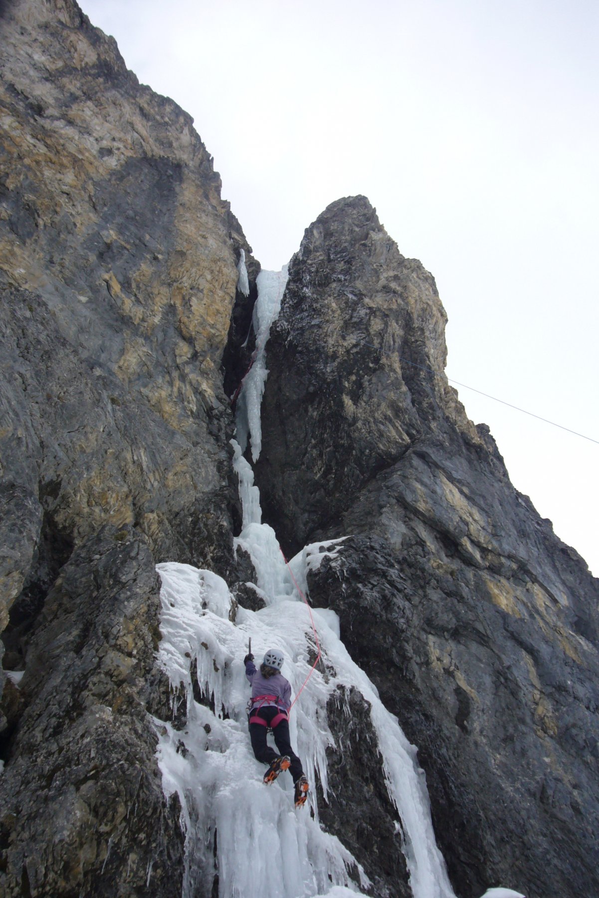 L1, 20 metri, spesso ghiaccio sottile all’inizio. Sosta su “Multimonti” nella nicchia. L2, 60 metri, stalattite (fix di protezione) e poi splendido muro. Calata da Abalakov.