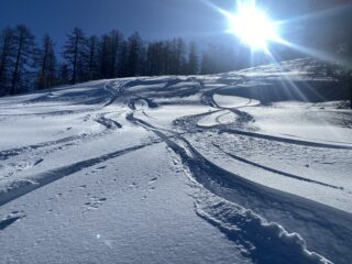 Giornata spaziale dopo una perturbazione importante. L’intento era esplorativo, non avendo idea di quanta neve ci fosse alla partenza, ma sorpresa! C’erano almeno 50 cm da subito. Seguito una splendida traccia fatta ieri fino a Prato in Fiera; decido di proseguire e batterla fino in cima: scelta azzeccata. Con la neve abbondante caduta e le basse temperature di questi giorni lo spettacolo è garantito: dalla vetta si scende su crosta portante farinosa bellissima da sciare fino alla cresta. Fatto il traverso in velocità, la parte di discesa sulle vecchie piste è indescrivibile, le 5 stelle ci stanno tutte. Da quota 1700 ca. la musica cambia e si incontra crosta a tratti non portante; essendo sceso verso le 10:00 ho però avuto pochi problemi in quanto la portanza dello strato superficiale era spesso più che sufficiente.